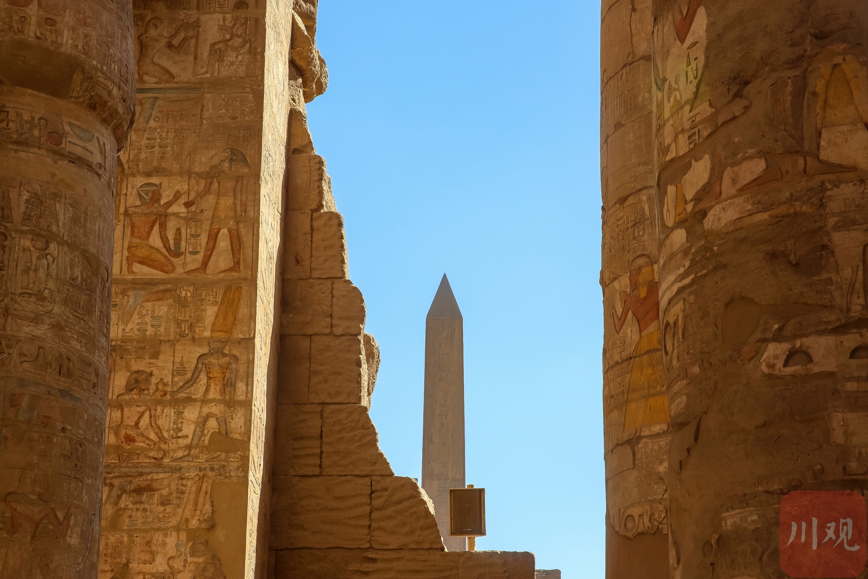 埃及卢克索神庙遗址,古老石柱与残壁上的彩绘浮雕,框出远方的方尖碑。