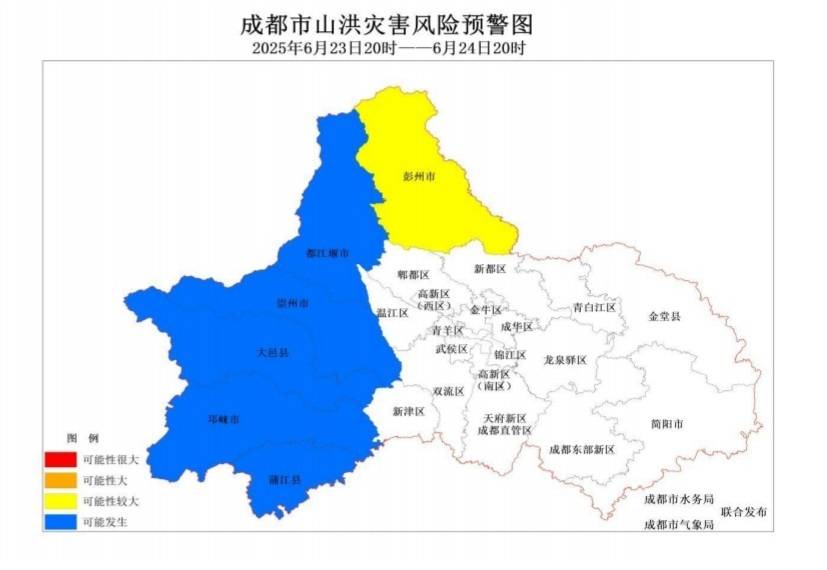 经成都市水务局、成都市气象台联合会商,6月23日20时至24日20时,彭州市发生山洪灾害可能性较大,为黄色预警;崇州市、都江堰市、邛崃市、大邑县、蒲江县可能发生山洪灾害,为蓝色预警。