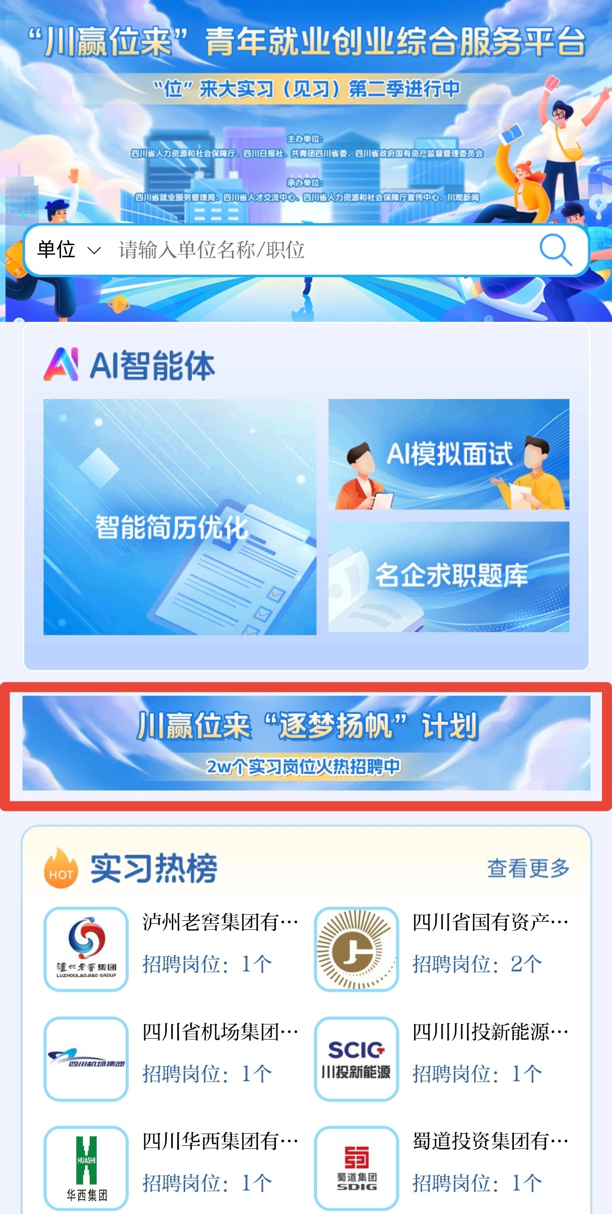 下载并打开川观新闻客户端,点击“川赢位来”青年就业创业综合服务平台 ,找到“川赢位来逐梦扬帆计划”,即可查看实习岗位信息。