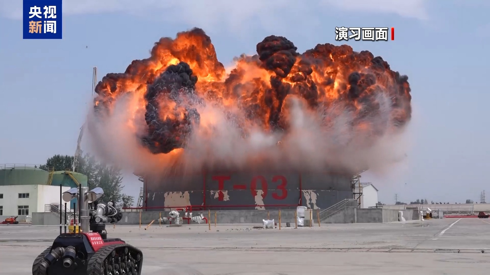 在河南濮阳,演习模拟大型危化品罐区储罐遭雷击着火,我国自主研发的超大流量远程拖车炮等装备参与成功控制火势。