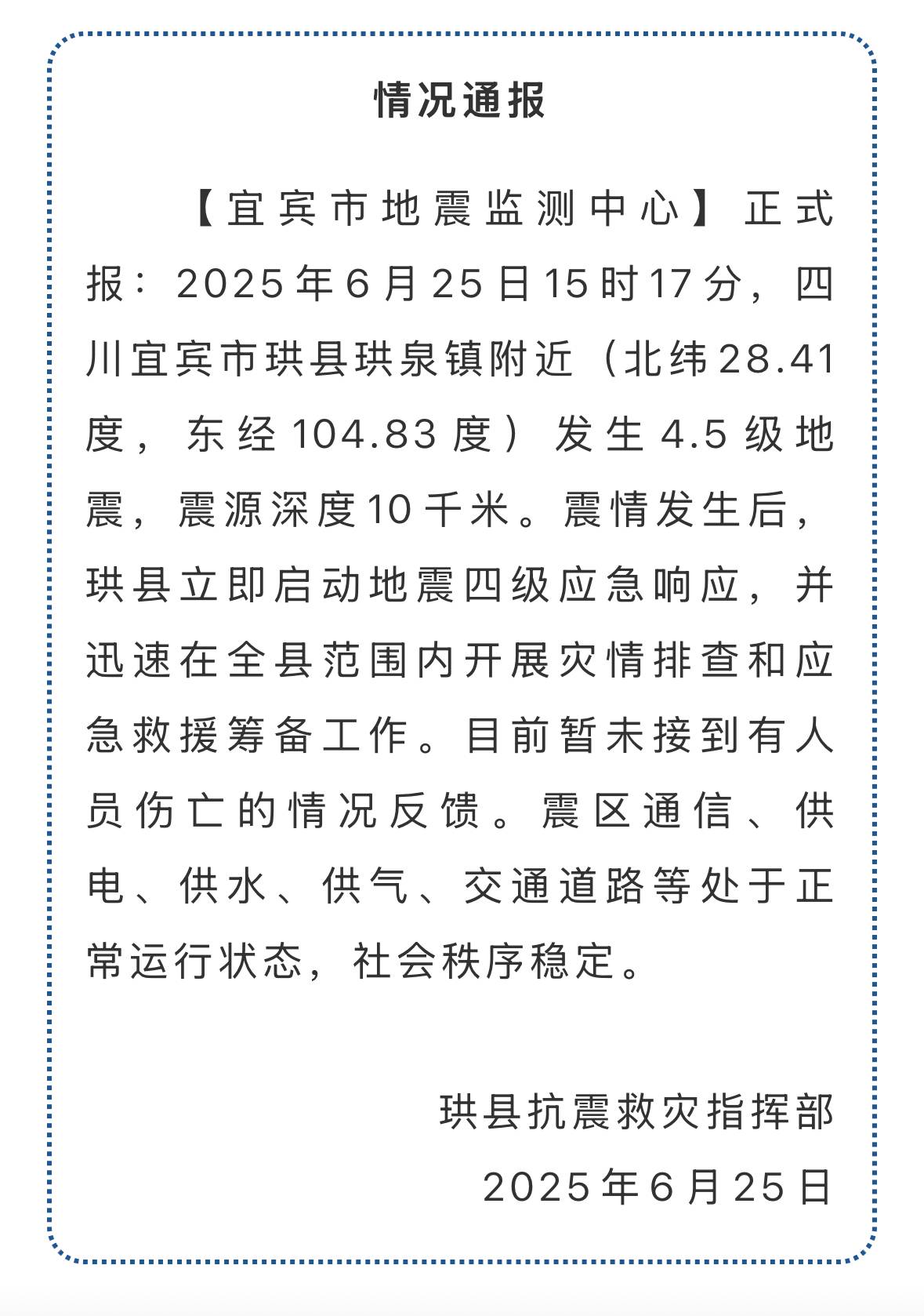 据中国地震台网正式测定:6月25日15时17分在四川宜宾市珙县(北纬28.41度,东经104.83度)发生4.5级地震,震源深度10千米。宜宾市区有明显震感。