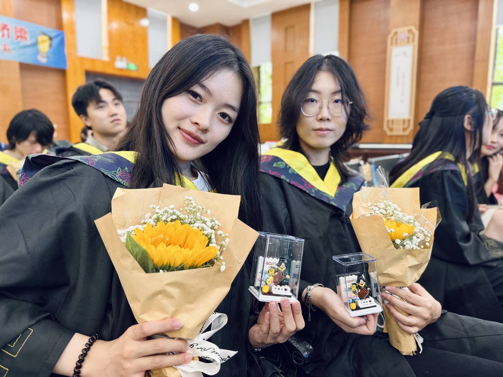 毕业生们展示毕业礼物。