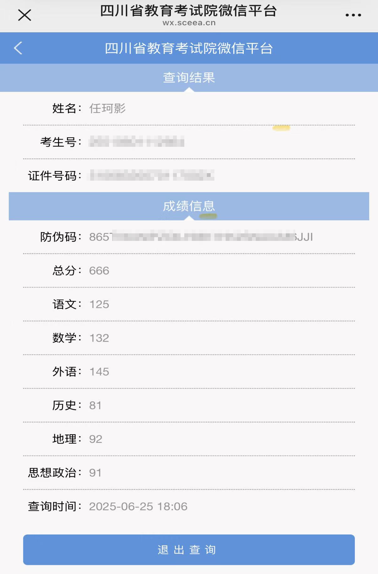 6月25日傍晚,2025年四川高考成绩已经可以查询。四川在线记者从绵阳东辰中学了解到,该校考生任珂影同学取得历史类总分666分的成绩。