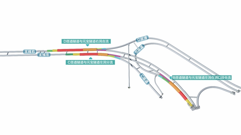 最大的挑战之一是隧道交叠。在元宝枢纽地下互通中,B匝道隧道与主线元宝隧道左右洞上下交叉,共有三个交叉影响段落,分别是95米、70米、50米,上下隧道垂直高差最短处仅为33厘米,相当于上下两条隧道几乎紧紧挨在一起,而两条隧道总开挖高度又接近21米,相当于7层楼高。“在隧道上再修隧道,稍有不慎就可能引发垮塌等事故。”廖志宣说,交叠隧道的部分还未施工,因为项目是世界之最,可供参考的案例很少,目前正和科研团队一起,研究系统化的技术解决方案,为山区大型地下互通建设探路。