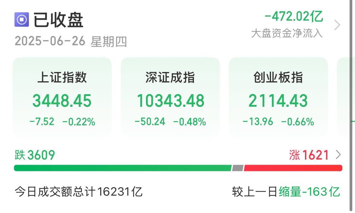 6月26日,A股三大指数量价齐跌。截至收盘,沪指跌0.22%,收报3448.45点;深成指跌0.48%,收报10343.48点;创业板指跌0.66%,收报2114.43点。全市场成交额16231亿元,较上日缩量163亿元。全市场超3600只个股下跌。