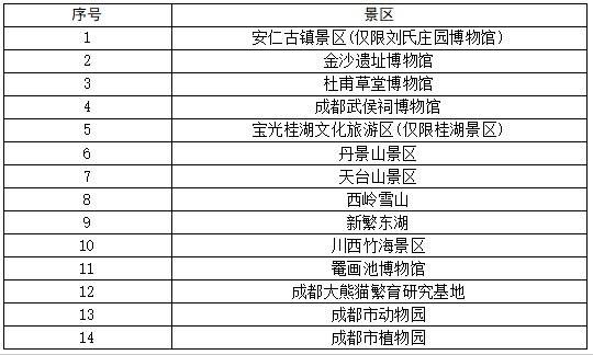“成都市无偿献血电子优待卡”持卡者可享受优待政策的14家景区名单。