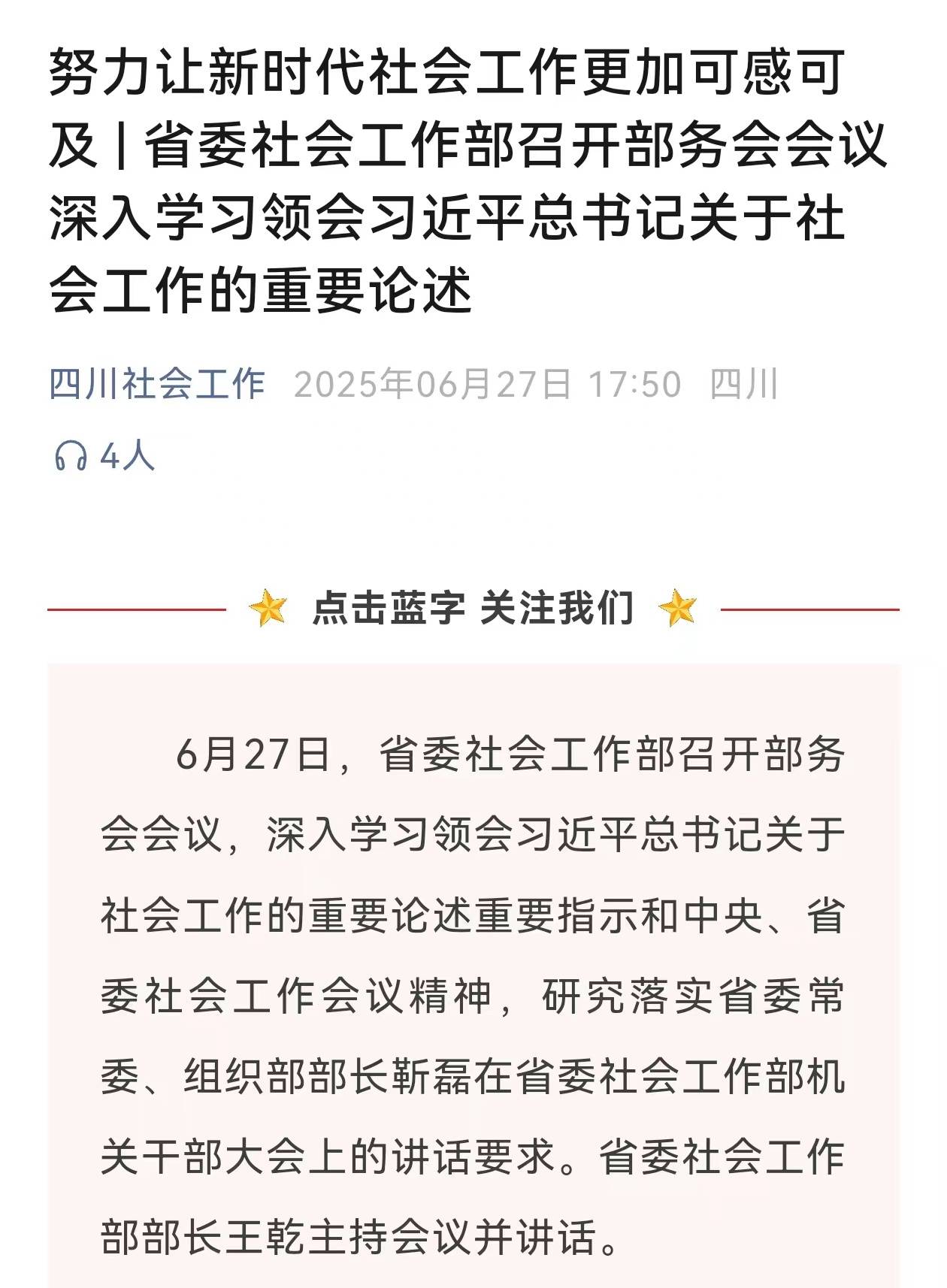 6月27日,据四川省委社会工作部官方微信公众号——“四川社会工作”消息,当日省委社会工作部召开部务会会议,深入学习领会习近平总书记关于社会工作的重要论述重要指示和中央、省委社会工作会议精神,研究落实省委常委、组织部部长靳磊在省委社会工作部机关干部大会上的讲话要求。省委社会工作部部长王乾主持会议并讲话。