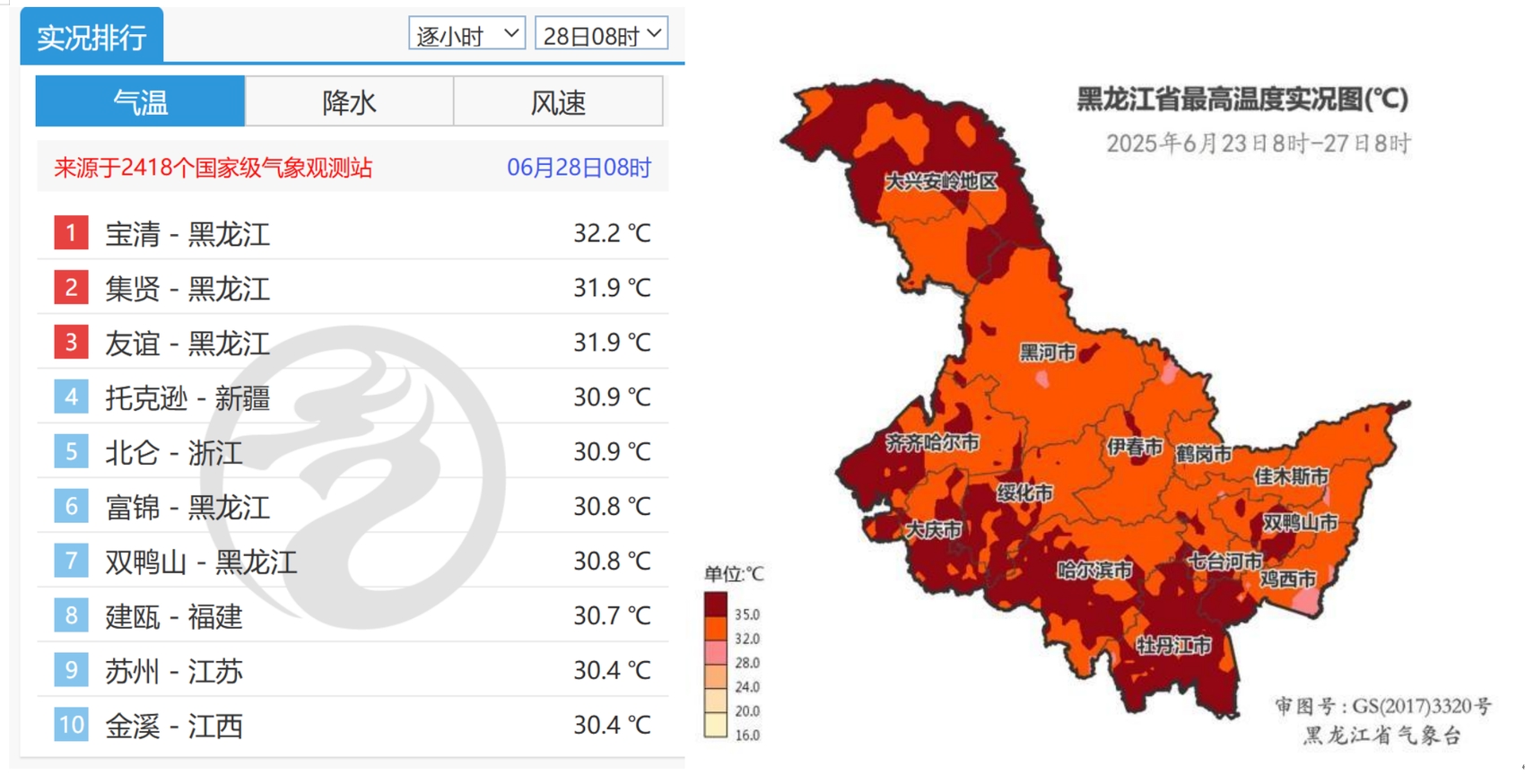 先吃个瓜:今天(6月28日)8时,黑龙江站点包揽了全国高温榜前三。