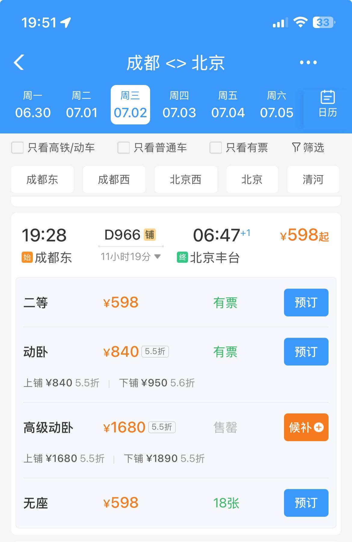 票价方面,动卧上铺为840元,下铺为950元;高级动卧为1680元,二等座和无座为598元。