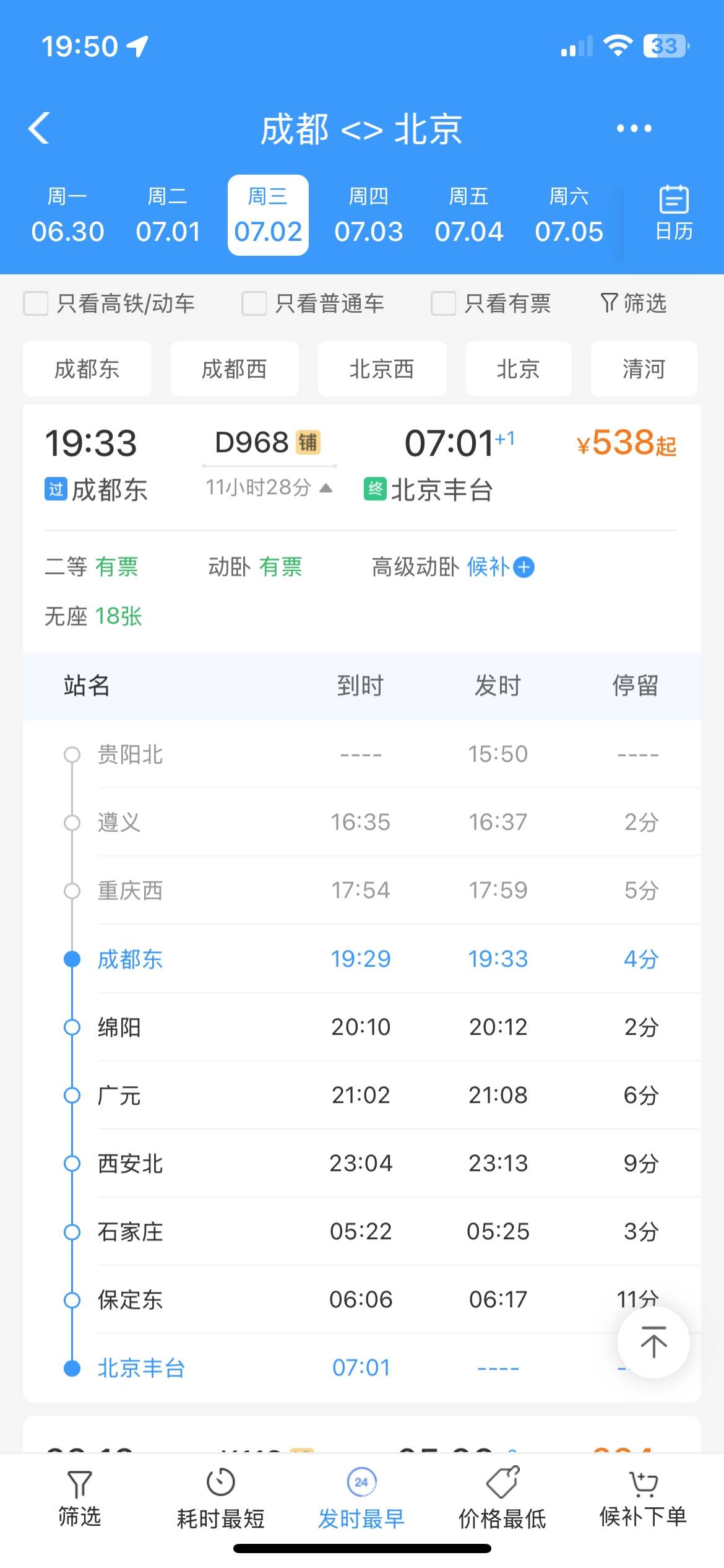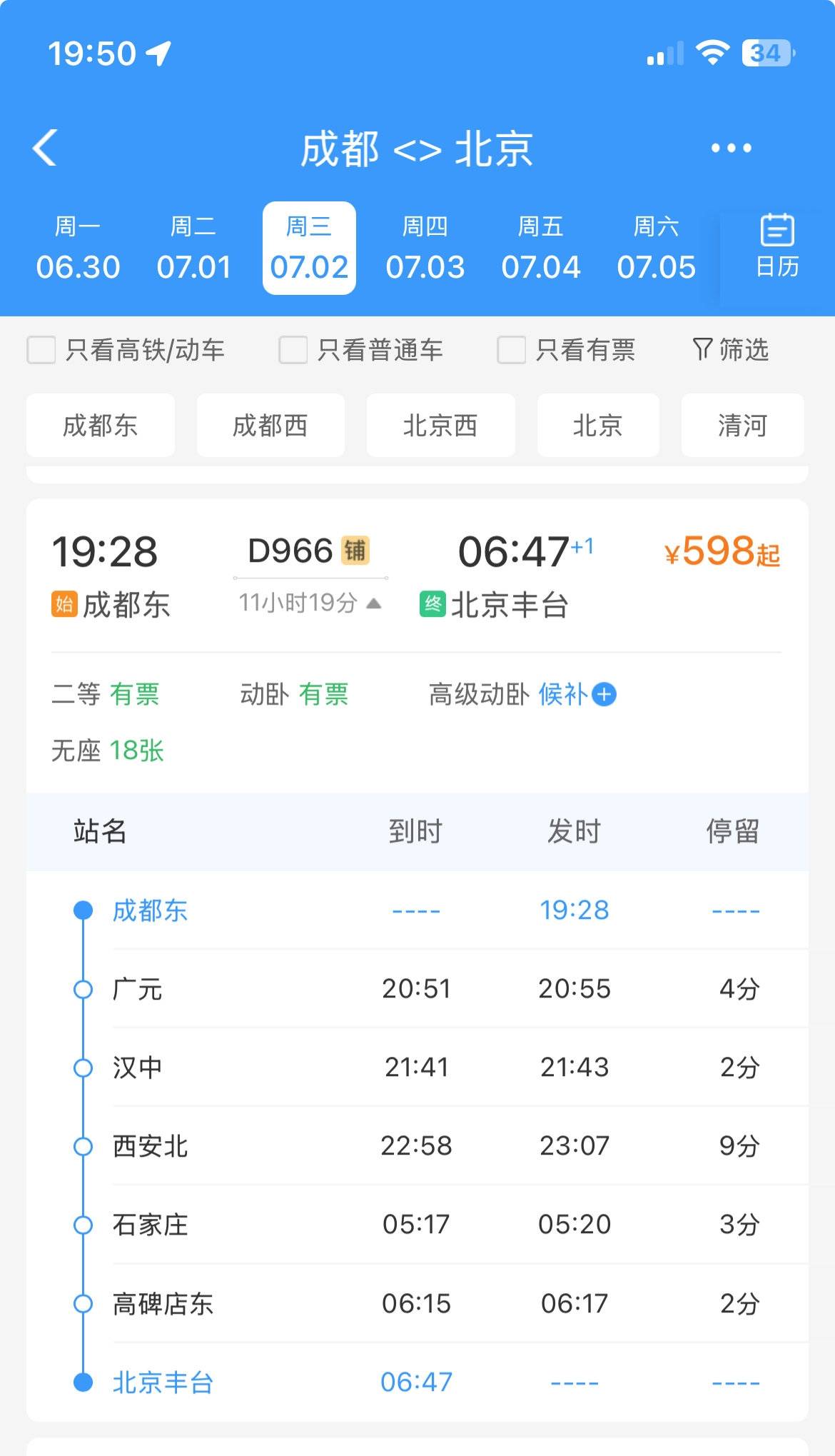 6月28日,记者查询12306铁路官方售票网站发现,成都至北京的动卧列车已经上线销售,共有两趟,分别是成都东始发终到北京丰台的D966次列车和贵阳北始发途经成都东终到北京丰台的D968次列车。两趟列车从成都发车时间均在19点30分左右,到达北京丰台的时间在第二天早上7点左右。开行时间11个多小时。