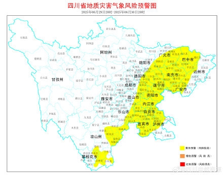 警惕!四川发布今夏最大范围地灾预警,覆盖18个市州97个县市区! 根据四川省气象台天气预报情况,结合四川省地质环境条件,6月29日20时至6月30日20时,全省地质灾害气象风险预警结果如下: