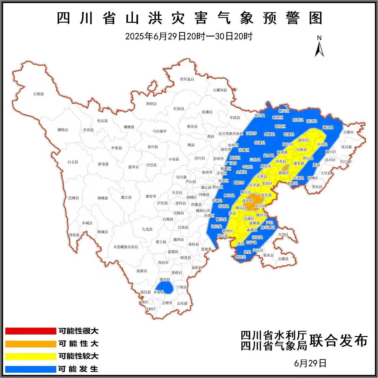 预警信息显示,6月29日20时至30日20时,内江市市中区、资中、东兴、威远,遂宁市大英,资阳市安岳、雁江,自贡市沿滩、富顺,南充市嘉陵、顺庆等11个县(市、区)发生山洪灾害可能性大(橙色);内江市隆昌,遂宁市安居、蓬溪、船山、射洪,资阳市乐至,自贡市自流井、贡井、大安、荣县,南充市高坪、西充、仪陇、蓬安、营山、南部、阆中,宜宾市翠屏、叙州、南溪、屏山、高县、江安,巴中市恩阳、巴州、平昌、南江、通江,广安市武胜、岳池,广元市苍溪,德阳市中江,绵阳市盐亭、三台,泸州市泸县,成都市简阳,眉山市仁寿等37个县(市、区)发生山洪灾害可能性较大(黄色);宜宾市长宁、珙县、筠连、兴文,广安市广安、前锋、华蓥,广元市剑阁、昭化、旺苍、利州、朝天、青川,德阳市广汉、旌阳、罗江、绵竹、什邡,绵阳市梓潼、游仙、涪城、江油、安州、北川、平武,乐山市犍为、沐川、井研、五通桥、马边、市中区、沙湾、峨边、夹江,泸州市龙马潭、江阳、纳溪、合江、叙永,达州市渠县、通川、达川、宣汉、万源,成都市金堂、青白江、龙泉驿、双流、彭州,眉山市青神、彭山、东坡,攀枝花市米易,凉山州雷波、会理、德昌等56个县(市、区)可能发生山洪灾害(蓝色)。