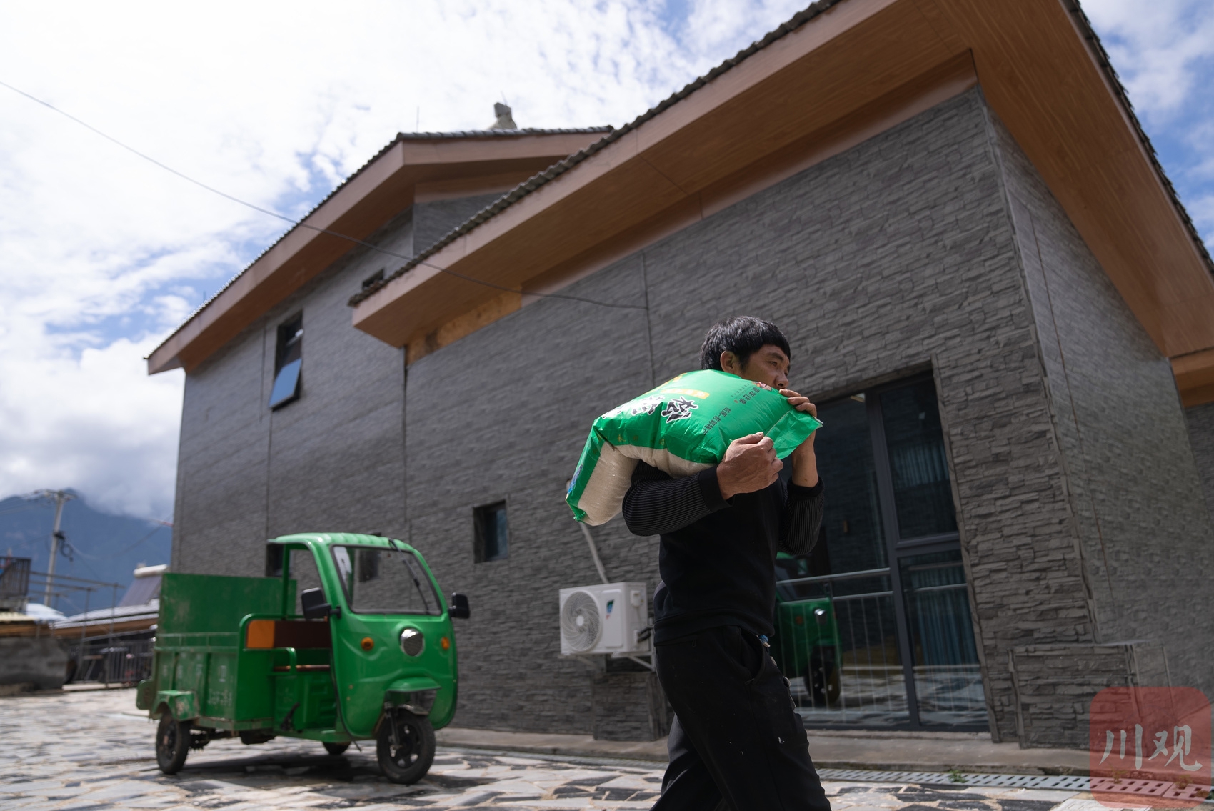 6月26日,阿布洛哈村布谷鸟客栈承包人、42岁的村民且沙子呷扛着刚买回来的大米,经过两层楼的客栈。