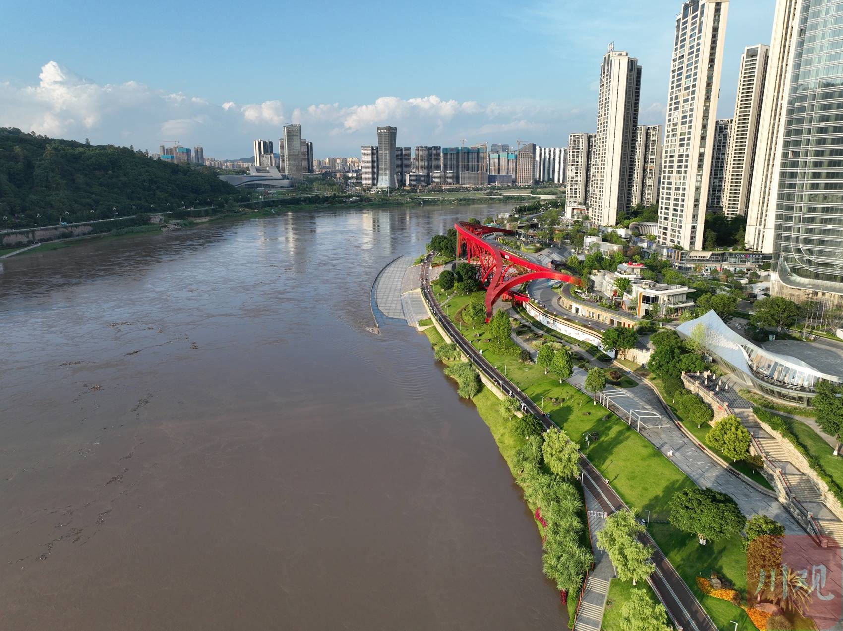 从空中俯瞰,洪峰经过,宜宾合江门广场周边的江水流速加快,水位上涨。