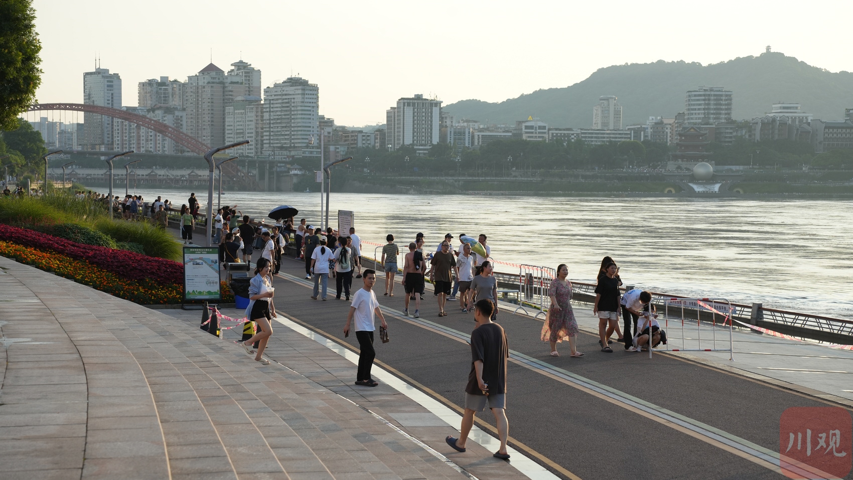 长江公园是宜宾市民傍晚休闲散步的主要场所之一,公园沿江步道上,水利、城市综合管理等部门设置了十余组救生圈、救生衣等器具,记者从叙州区综合行政执法局了解到,部分装备是今年新添置的。江边,广播反复提醒市民不要在江边戏水,看护好老人小孩,沿江还有许多来自周边社区的志愿者查看江边市民的活动情况,维护秩序。