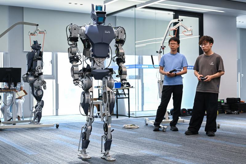 6月30日,在武汉格蓝若智能技术股份有限公司,华中科技大学博士研究生钱乐天(右)对“劳动者”系列人形机器人进行平地全向行走测试。