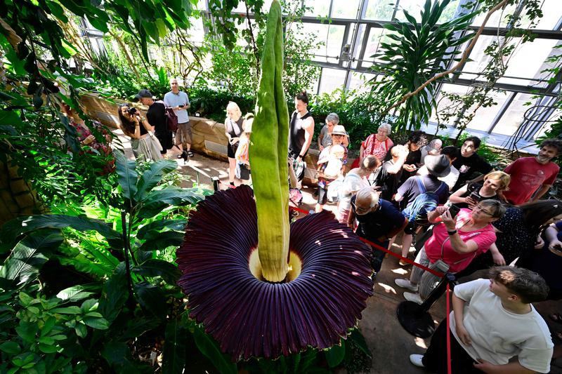 6月30日,在德国柏林植物园,游客们驻足欣赏盛开的泰坦魔芋。