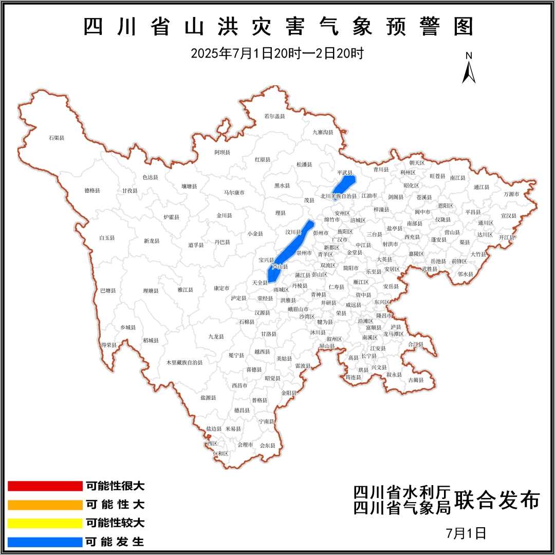 预警显示,2025年7月1日20时至2日20时,雅安市芦山、天全、宝兴,阿坝州汶川,绵阳市北川、平武,成都市都江堰、大邑、彭州、崇州等10个县(市、区)可能发生山洪灾害。