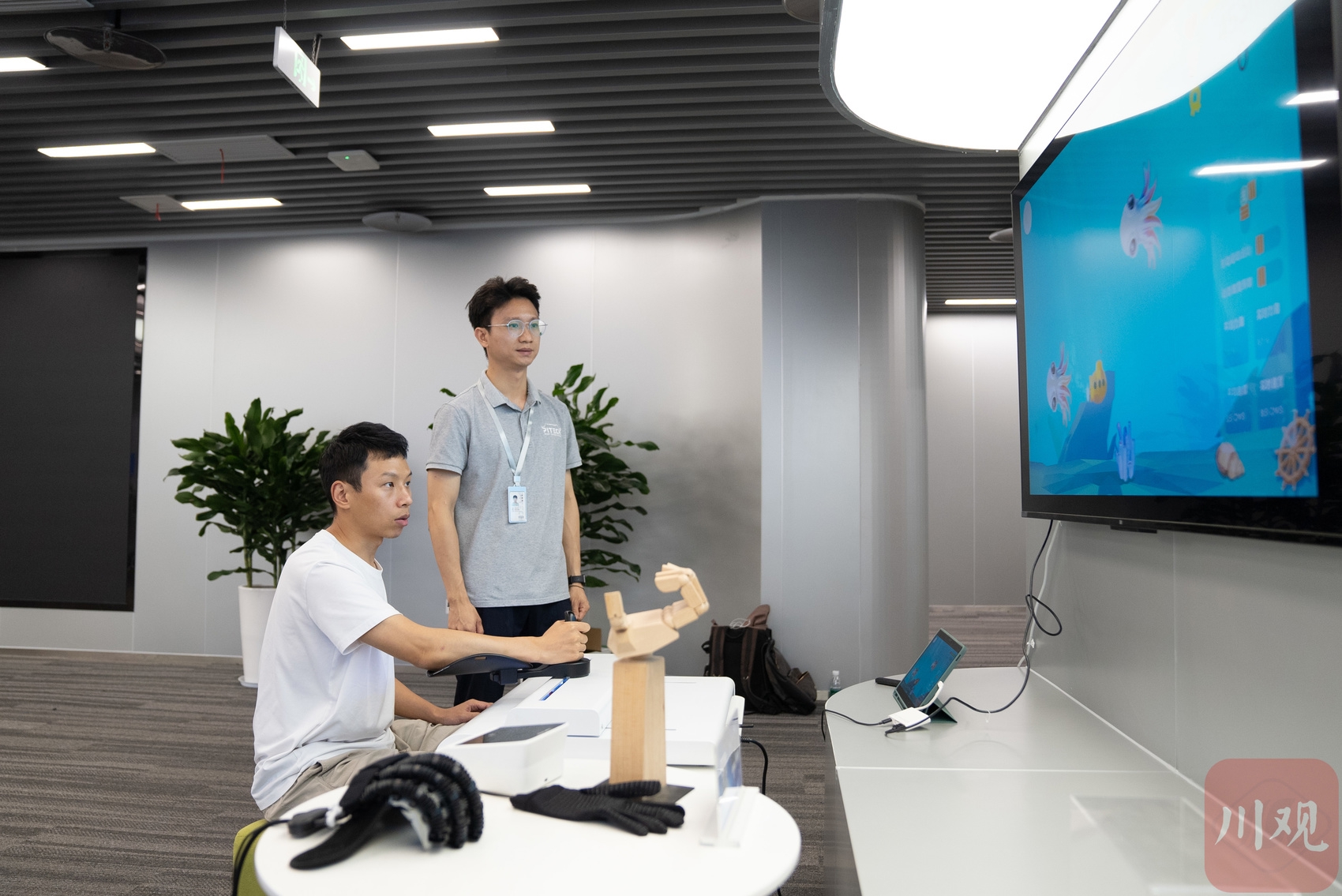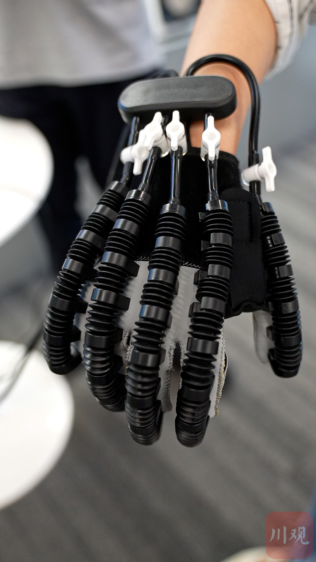 7月1日,在成都“今福蓉长者之家”养老院康复训练室里,我看到一位82岁的奶奶坐在扶手椅上。中风后遗症让她的左手指僵硬、蜷曲,日常抓握十分费力。康复师为她戴上动力手套。随着一声轻快的启动音效,动力手套开始引导她僵硬的手指,模仿着右手的动作,缓缓张开、合拢。屏幕上,一只只小鸭子跑过,练习了几次,奶奶顺利抓到了一只。“用起来还可以呢!手感觉没那么紧了。”她对我感叹说。