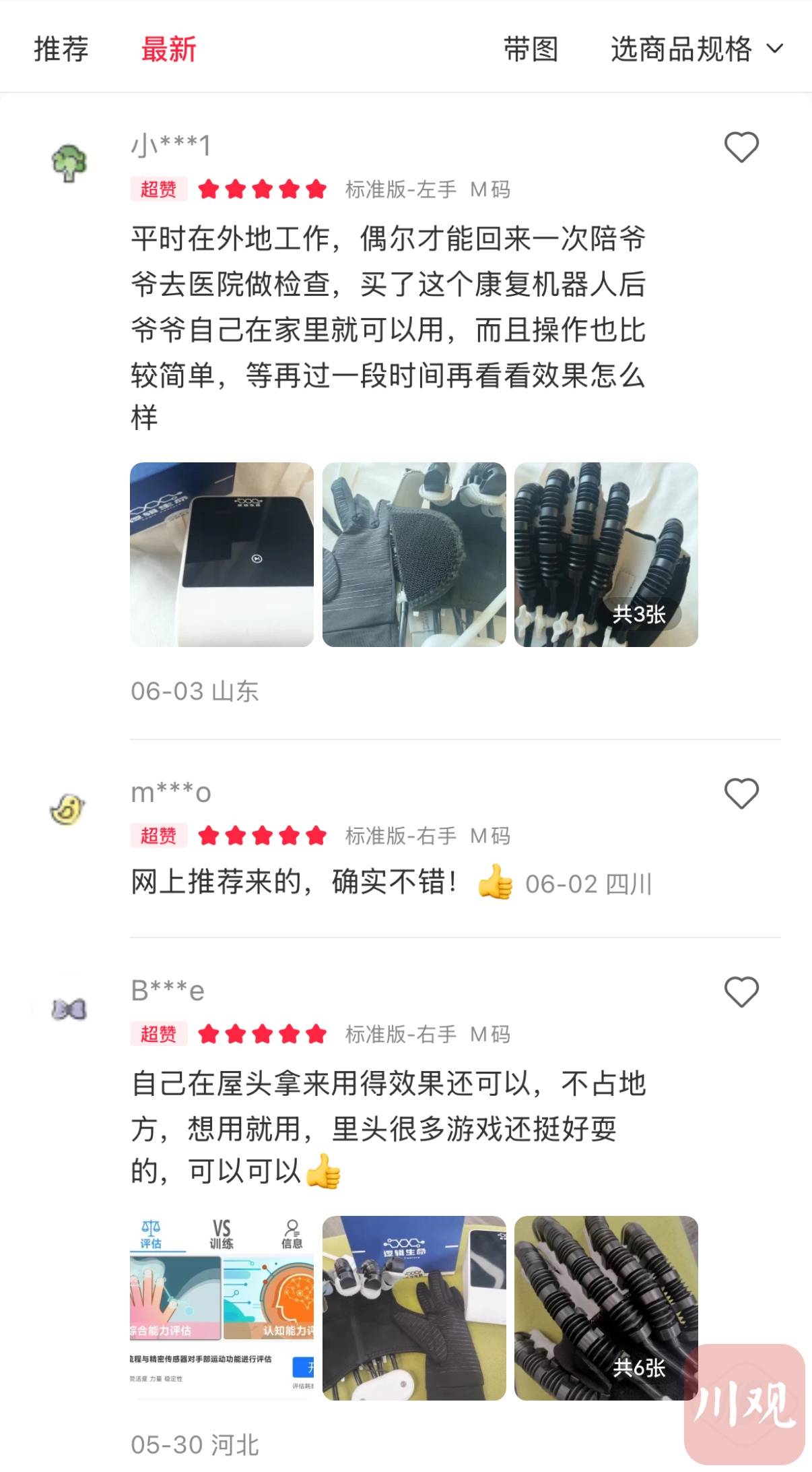 翻看手部训练机器人在京东、小红书等平台的买家反馈评论,其中大多数为子女为老人购买。在华西启德身心健康促进中心,提供了2套手部训练机器人用于展示体验。负责人伍余告诉我,产品投放以来,大部分咨询体验的也是中青年。“体验后,大家评价不错,觉得比常规机械训练手套更智能,并且家里多个老人都能用。”