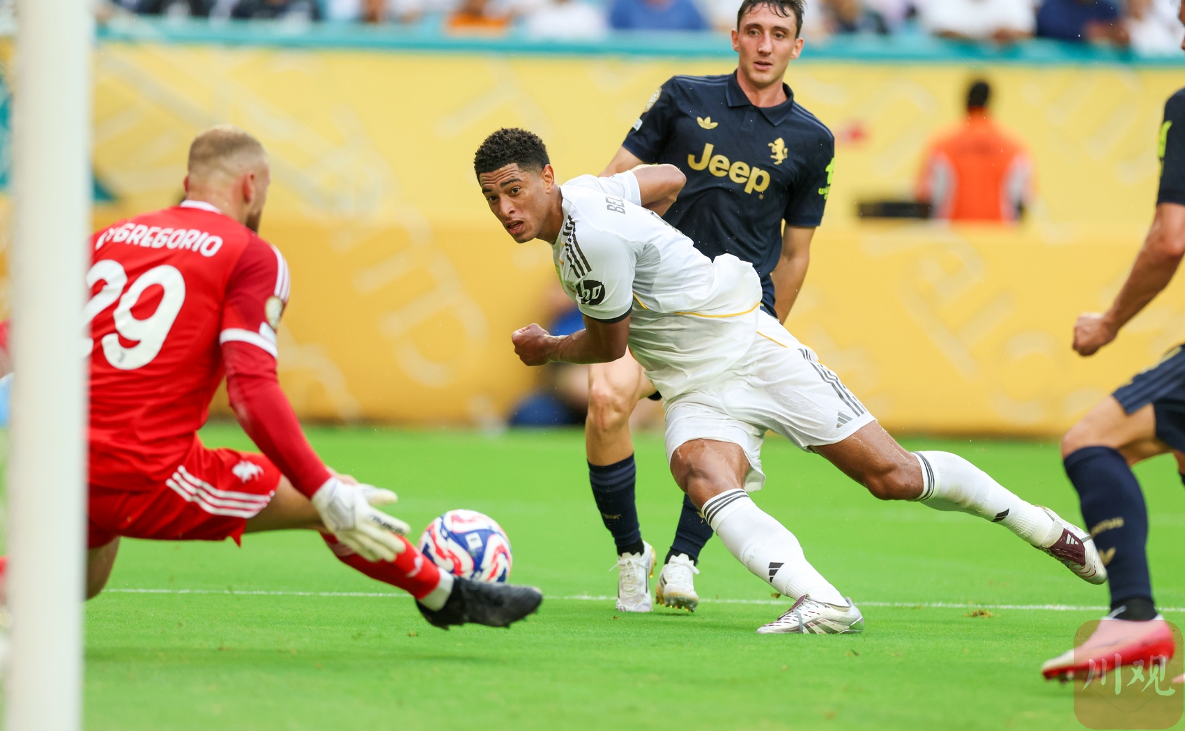 皇家马德里队贝林厄姆绝佳机会射门被尤文图斯队门将扑出。
