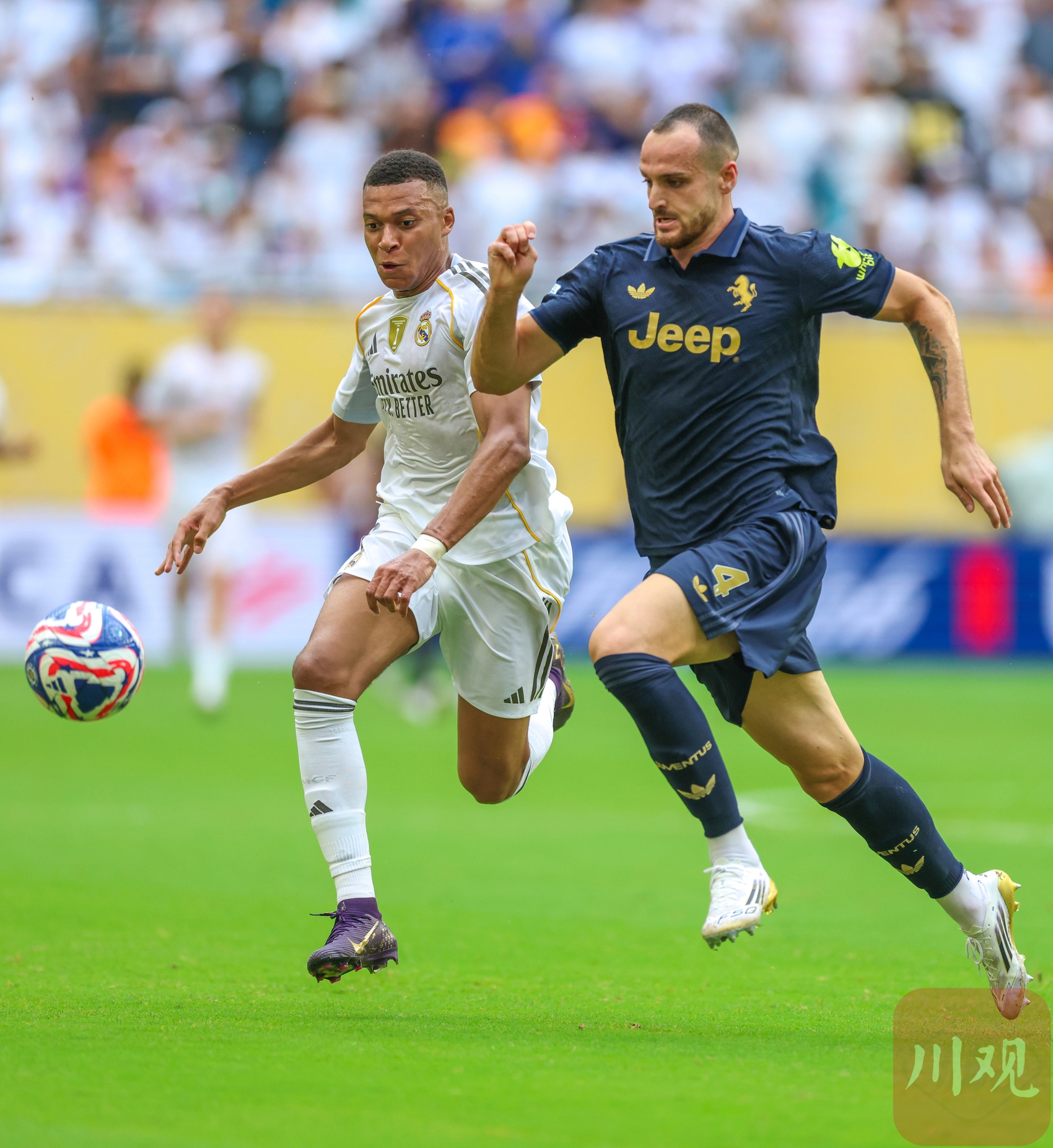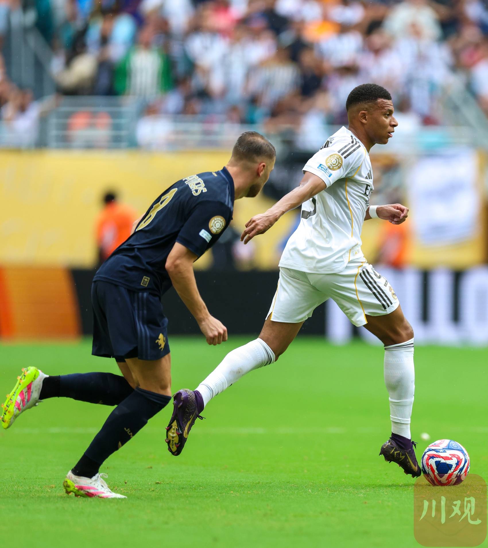 皇家马德里队姆巴佩高速突破尤文图斯队员的防守。