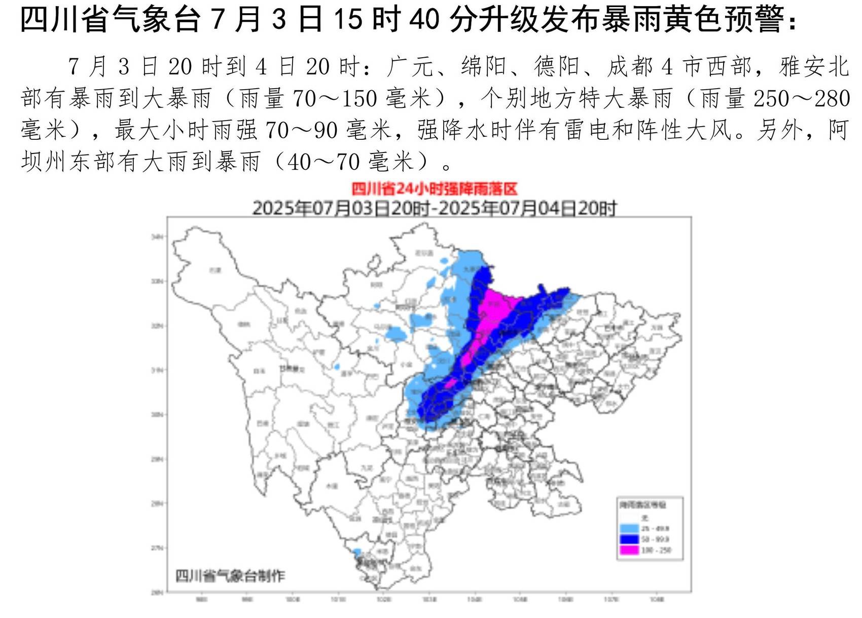 7月3日20时到4日20时:广元、绵阳、德阳、成都4市西部,雅安北部有暴雨到大暴雨(雨量70~150毫米),个别地方特大暴雨(雨量250~280毫米),最大小时雨强70~90毫米,强降水时伴有雷电和阵性大风。另外,阿坝州东部有大雨到暴雨(40~70毫米)