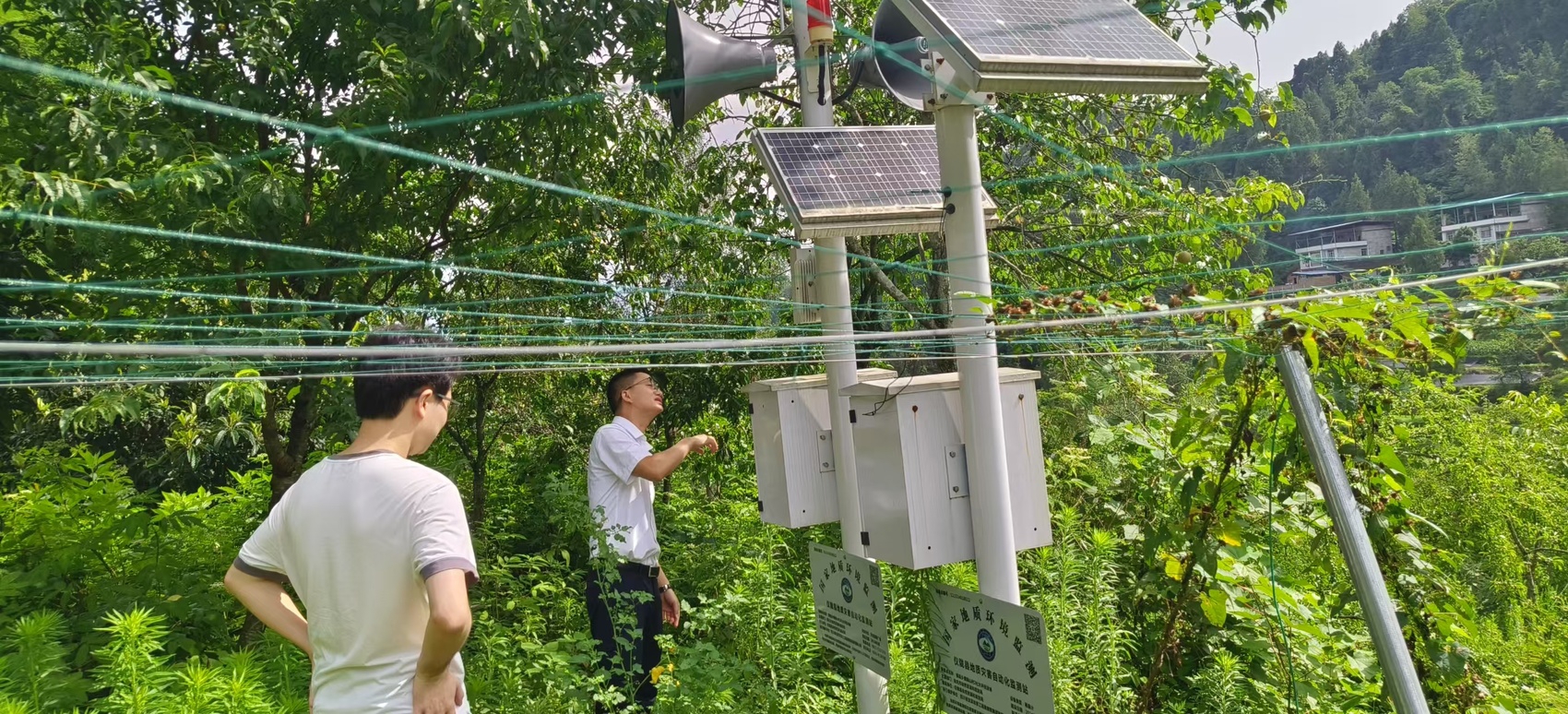 李熊成(右)在插旗山村一地质灾害监测点,查看监测仪的各项数值。