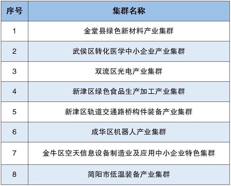 近日,2025年度四川省中小企业特色产业集群名单公布,共35个集群入选,其中成都8个集群上榜,包括金堂县绿色新材料产业集群、武侯区转化医学产业集群、双流区光电产业集群、新津区绿色食品生产加工产业集群、新津区轨道交通路桥构件装备产业集群、成华区智能机器人产业集群、金牛区空天信息设备产业集群、简阳市低温装备产业集群。