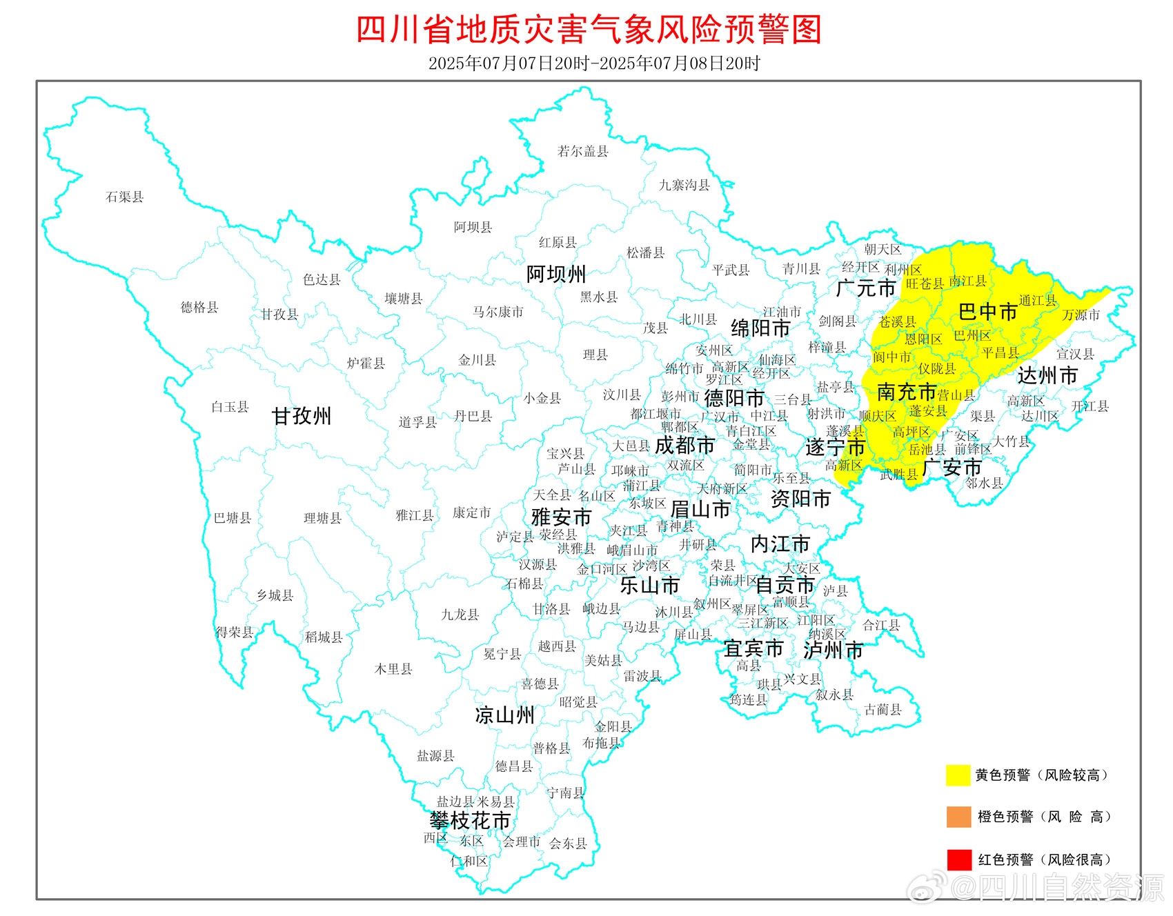 根据四川省气象台天气预报情况,结合四川省地质环境条件,7月7日20时至7月8日20时,全省地质灾害气象风险预警结果如下: