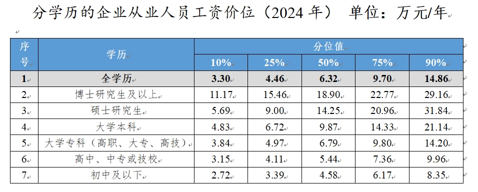 工资价位指企业从业人员在报告期内的工资水平,包括基本工资、奖金、津贴和补贴、加班加点工资和特殊情况下支付的工资等,在一定程度上体现了劳动力市场价格水平。”省人力资源社会保障厅相关负责人介绍,本次发布的信息,包括了全省不同区域、不同行业门类、不同学历、岗位等级、工龄的企业从业人员工资价位、技能人才工资价位。具体工资价位以分位值形式展现,包含10%分位值、25%分位值、50%分位值、75%分位值和90%分位值。其中,50%分位值(即中位数)代表数据的中间水平,指的是有一半的样本低于该数值,并不等于平均值。