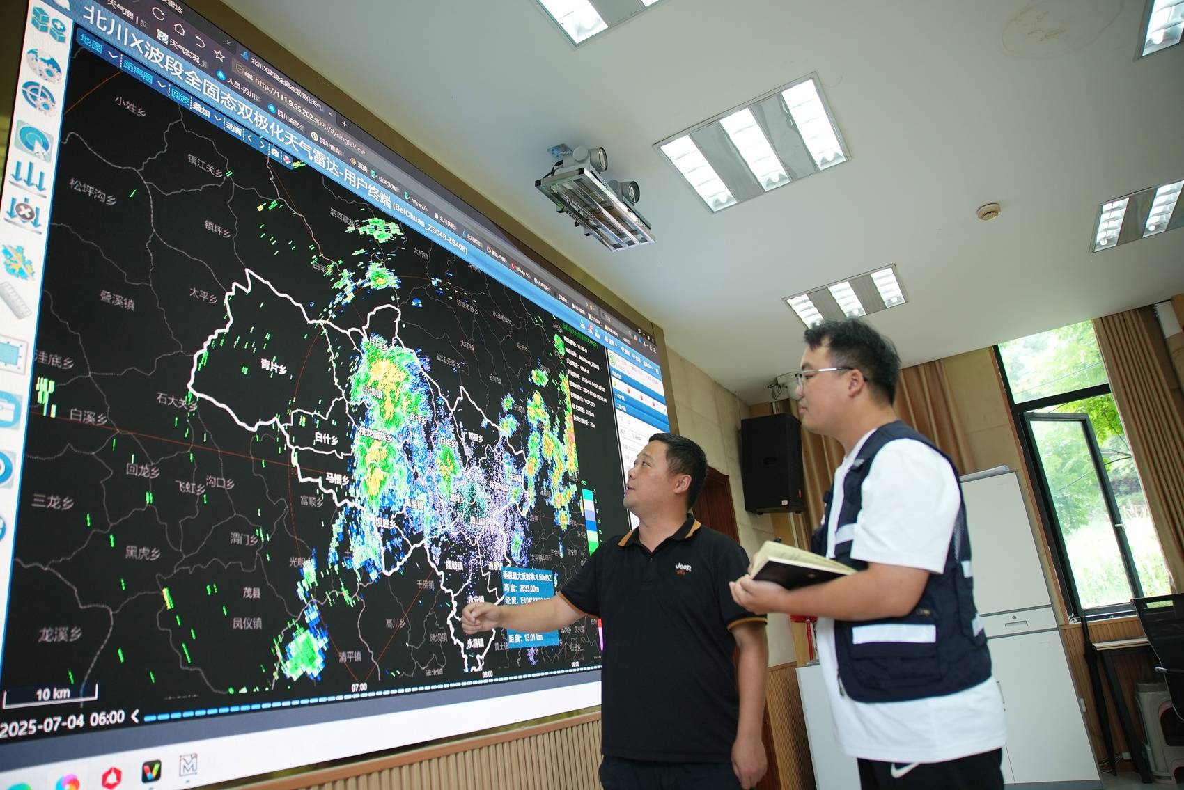 北川防汛抗旱减灾指挥部值班人员根据水利测雨雷达监测数据研判汛期。韦维 摄
