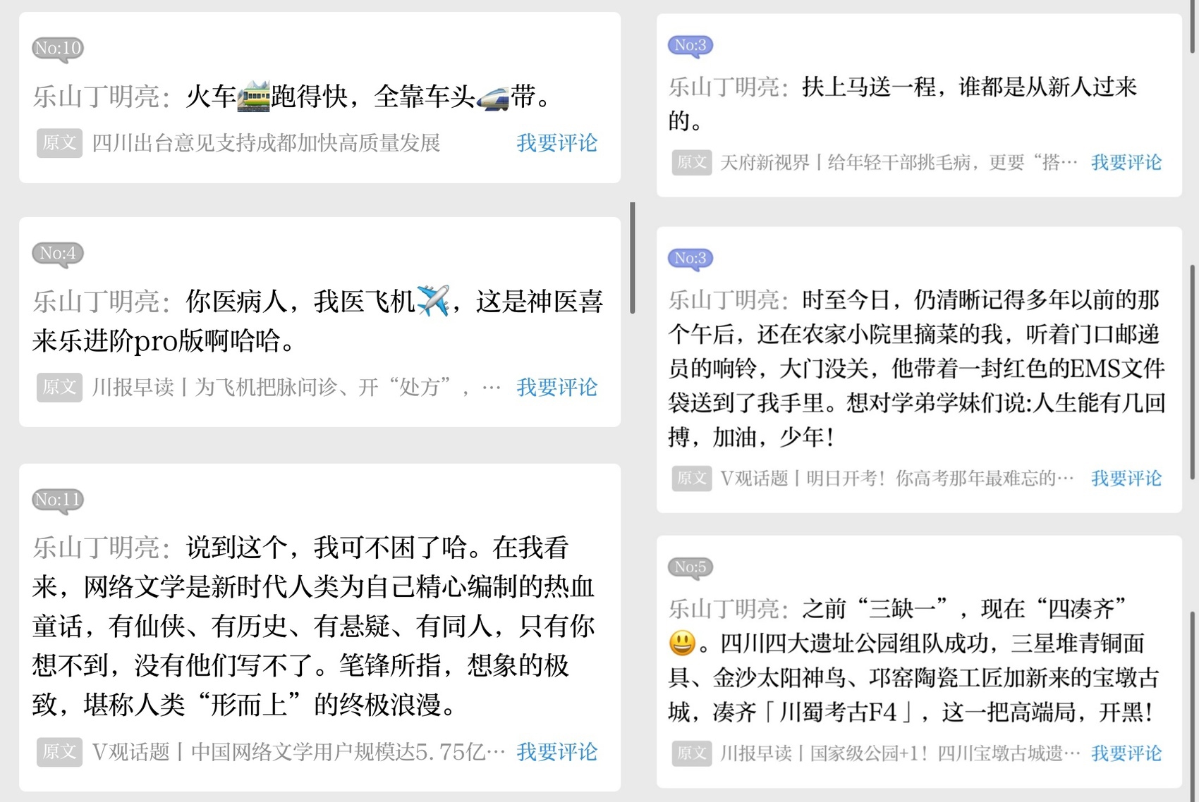 (@乐山丁明亮 每日悦评榜部分上榜评论)