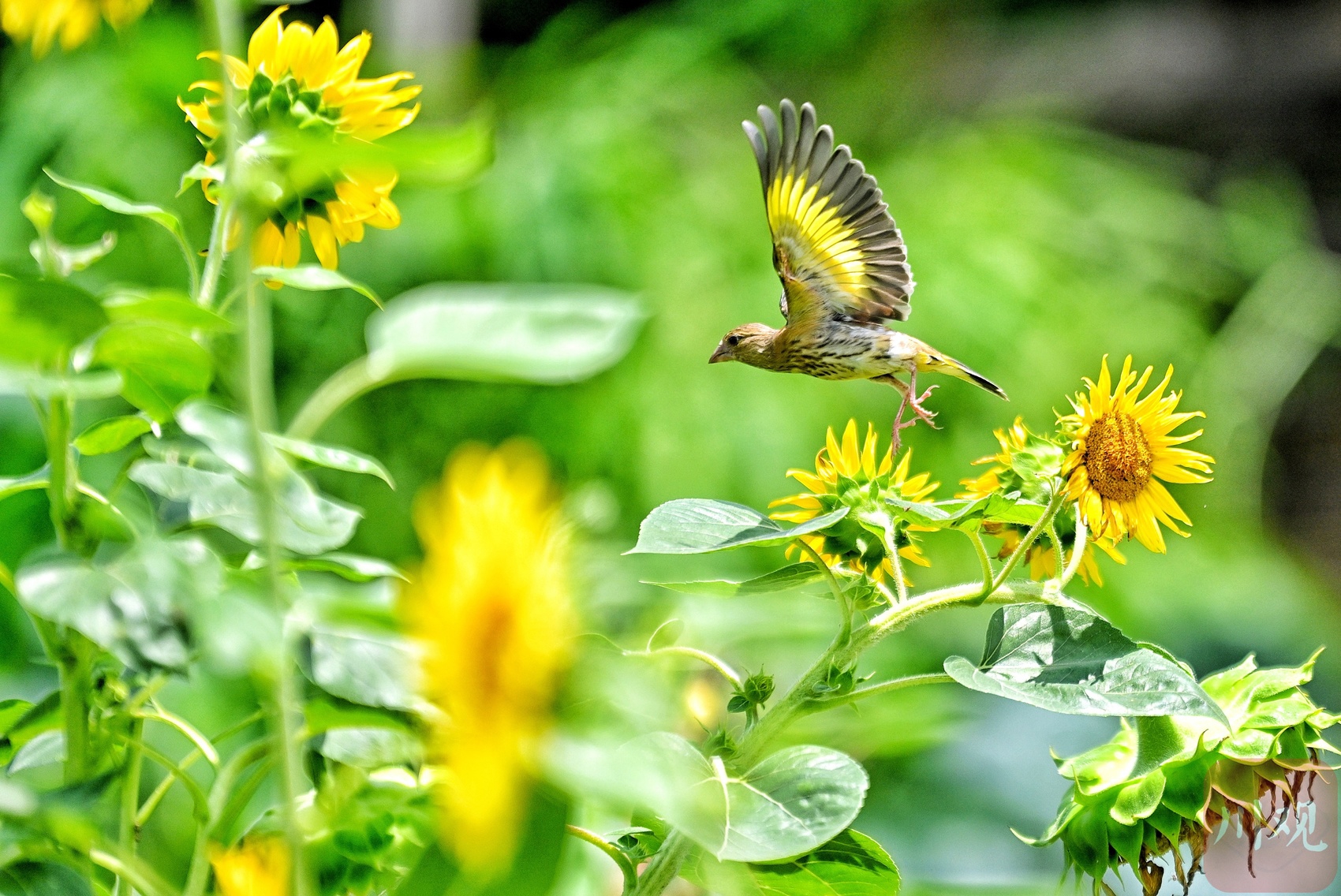 泥巴沱森林公园葵花田里飞翔的金翅雀。