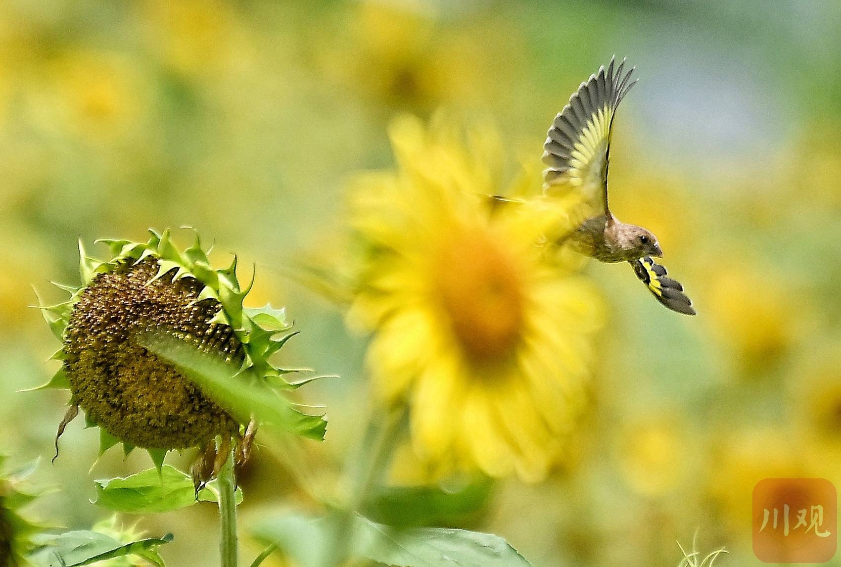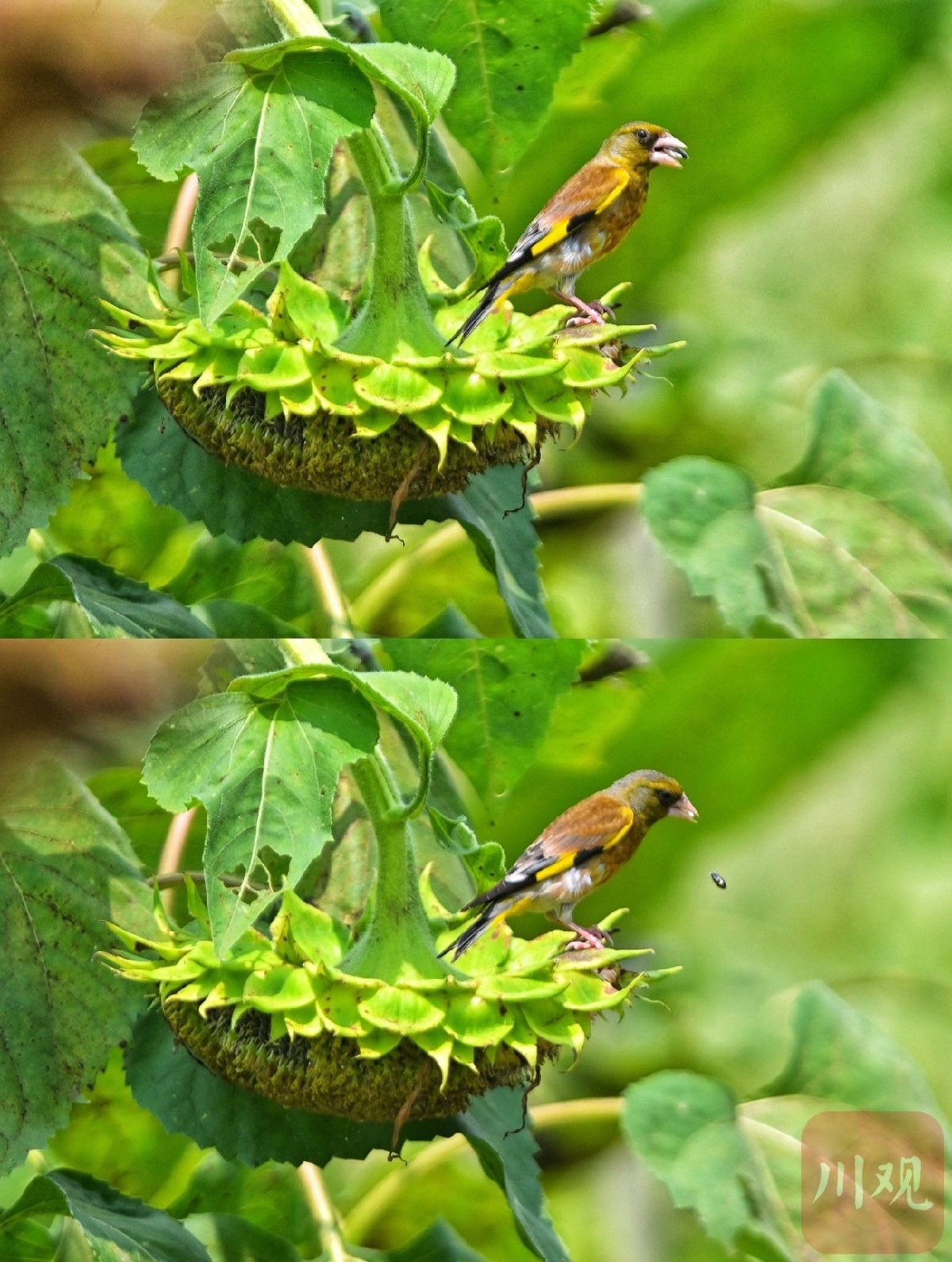在城西的另一处向日葵观赏地——温江汪家湾花海,这里同样也是金翅雀争先“嗑瓜子”的乐园。金翅雀们啄食葵花籽的动作十分娴熟,它们或倒挂在花盘上,或瞬间悬停于满是籽实的花盘前,口衔葵花籽,用巧舌剥开取仁,瓜子壳瞬间分离,其啄食葵花籽的功夫行云流水,令人赞叹。山坡处卖饮料、零食的小姑娘告诉记者:“这里的观赏向日葵已进入尾声,这段时间很多游客都是来拍鸟、观鸟的。”一旁的张女士接着说道:“7月底,这里的粉黛乱子草就开了,到时粉红一片,也好看得很。”