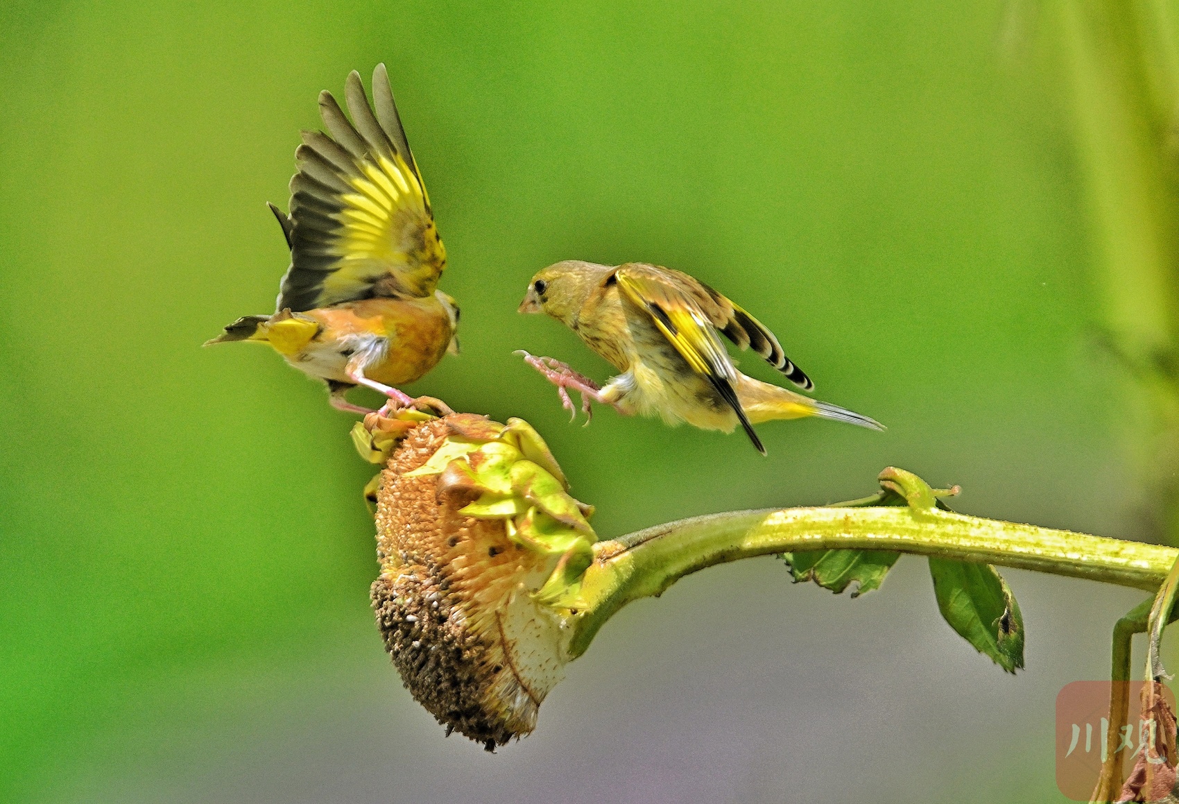 汪家湾花海里一对金翅雀在葵花盘上嬉戏。