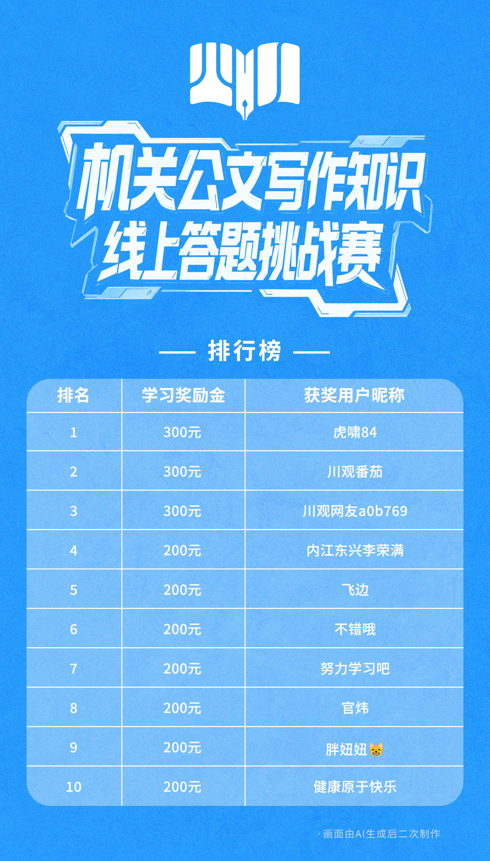近日,四川在线记者从四川省第八届机关公文写作技能大赛组委会获悉,由省委省直机关工委联合多家省级部门在川观新闻客户端上推出的“机关公文写作知识线上答题挑战赛”已于7月4日24:00正式结束。