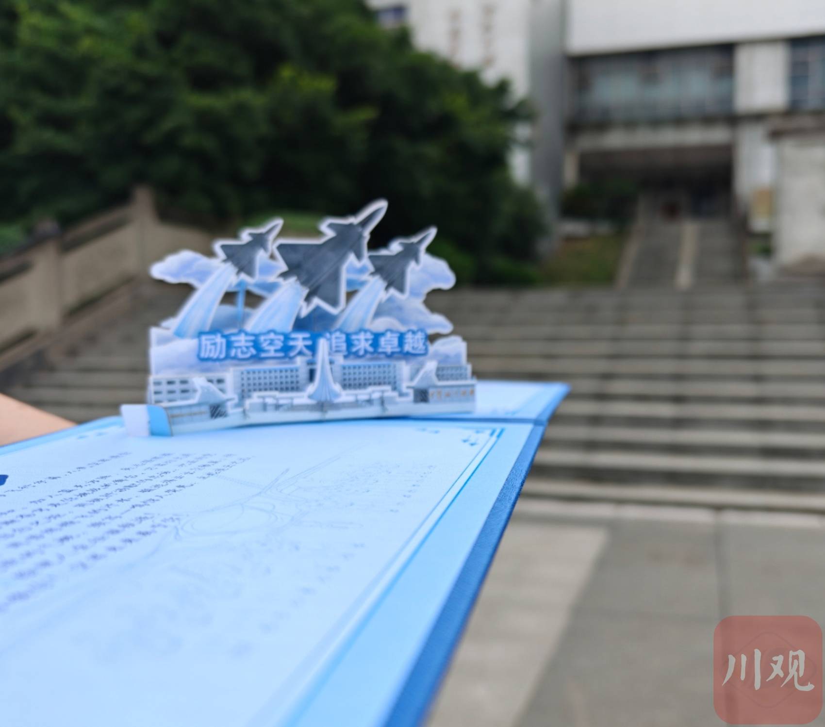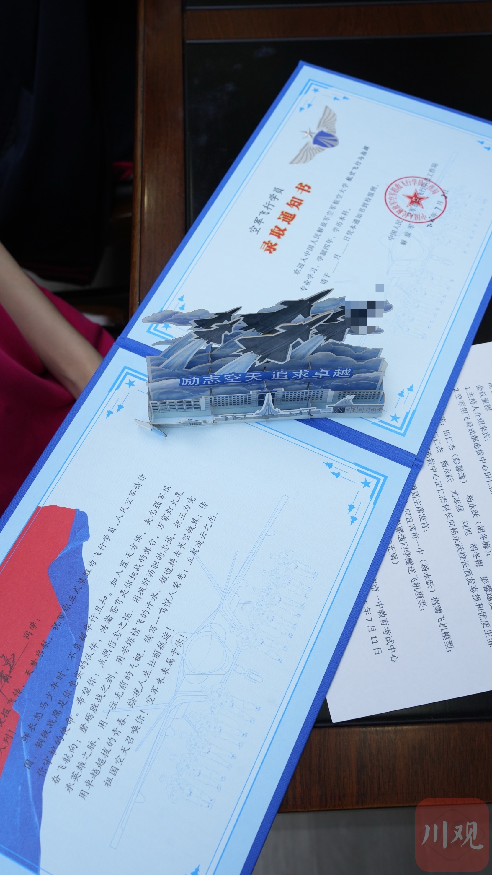 四川在线记者在现场看到,录取通知书以“空军蓝”为主要色调,封面上“逐梦空天”四个大字格外显眼。展开录取通知书,空军航空大学和三架战机立体模型映入眼帘,表达新学员距离实现自己空天梦想更进一步的美好祝愿。“对女空军飞行学员,招飞中心会采取现场送录取通知书的形式。”宜宾市一中相关负责人表示。