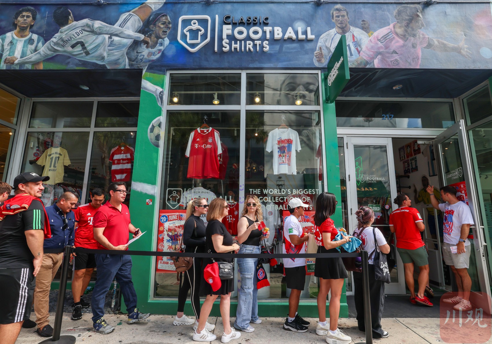 6月20日,来自世界各地的球迷在迈阿密经典球衣专卖店排队,准备购买正版球衣和纪念品,这里的商品大多由中国生产。