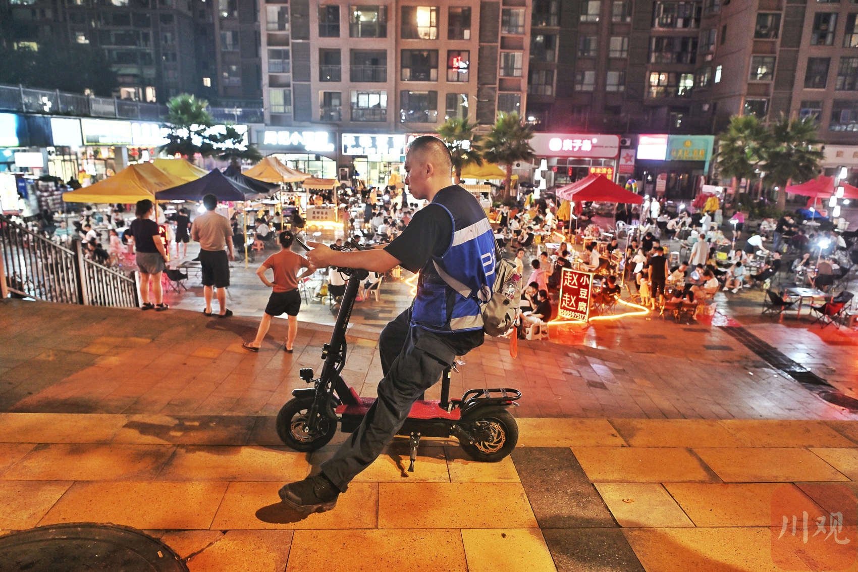 路边的代驾司机小吴注视着眼前的热闹场景,他在等待今晚有第二单生意。白天,他是当地一酒厂里的一名普通工人;夜幕降临,他兼职代驾,小吴的生活轨迹正是仁怀这座酒城的一个生动切面。白日里酒厂蒸腾的浓烈酒香,与深夜里弥漫的烧烤烟火气萦绕在酒都广场“四羊方尊“周围,共同构成了仁怀这座中国酒都的生活热度。