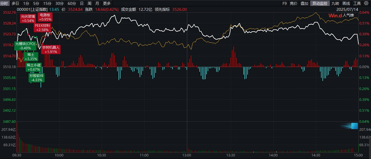 7月14日,A股三大指数呈现分化震荡态势。截至收盘,沪指微涨0.27%,报收3519.65点;深成指下跌0.11%,收于10684.52点;创业板指下跌0.45%,报2197.07点;北证50指数上涨0.55%。全市场成交额降至14809亿元,较前一交易日缩量超2500亿元,不过两市仍有超3100只个股上涨,市场结构性特征明显。