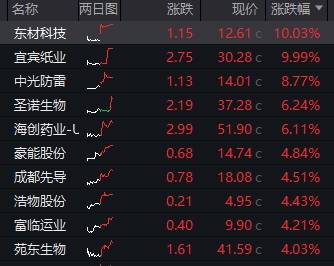 受盘面带动,川股方面,东材科技、宜宾纸业两只个股涨停。