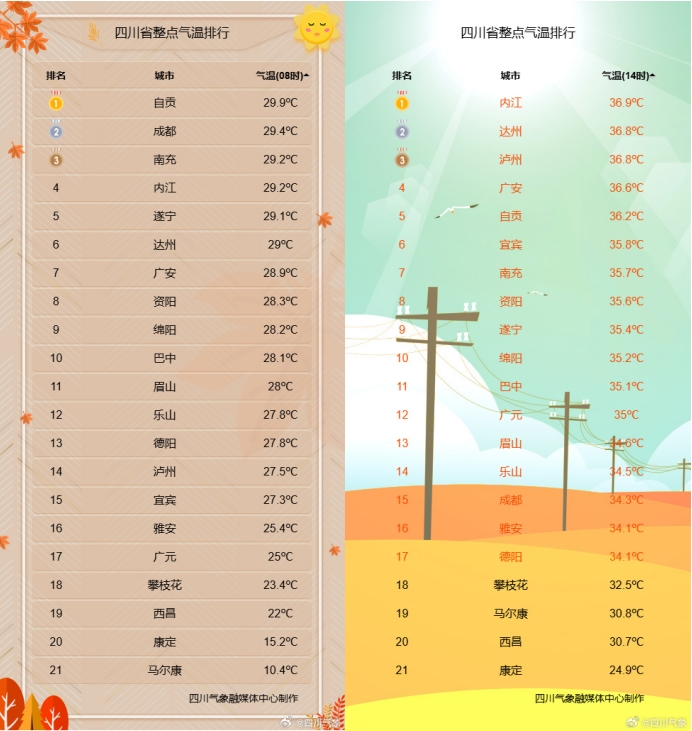 【7月14日8时(左)与14时(右)四川各城市实况气温图。 来源:四川气象的微博】