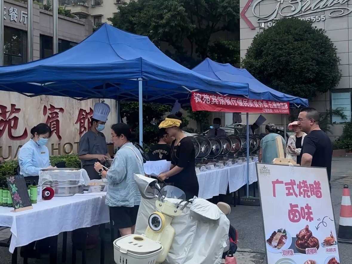 “师傅切快点儿,等下我还要去接娃娃。”7月14日下午5点半,位于成都人民中路三段的索菲斯锦苑宾馆门外,有顾客焦急地催促道。两个蓝色雨棚下,20多道冒着热气的菜肴已就位,最抢手的叉烧和小龙虾都已售罄。