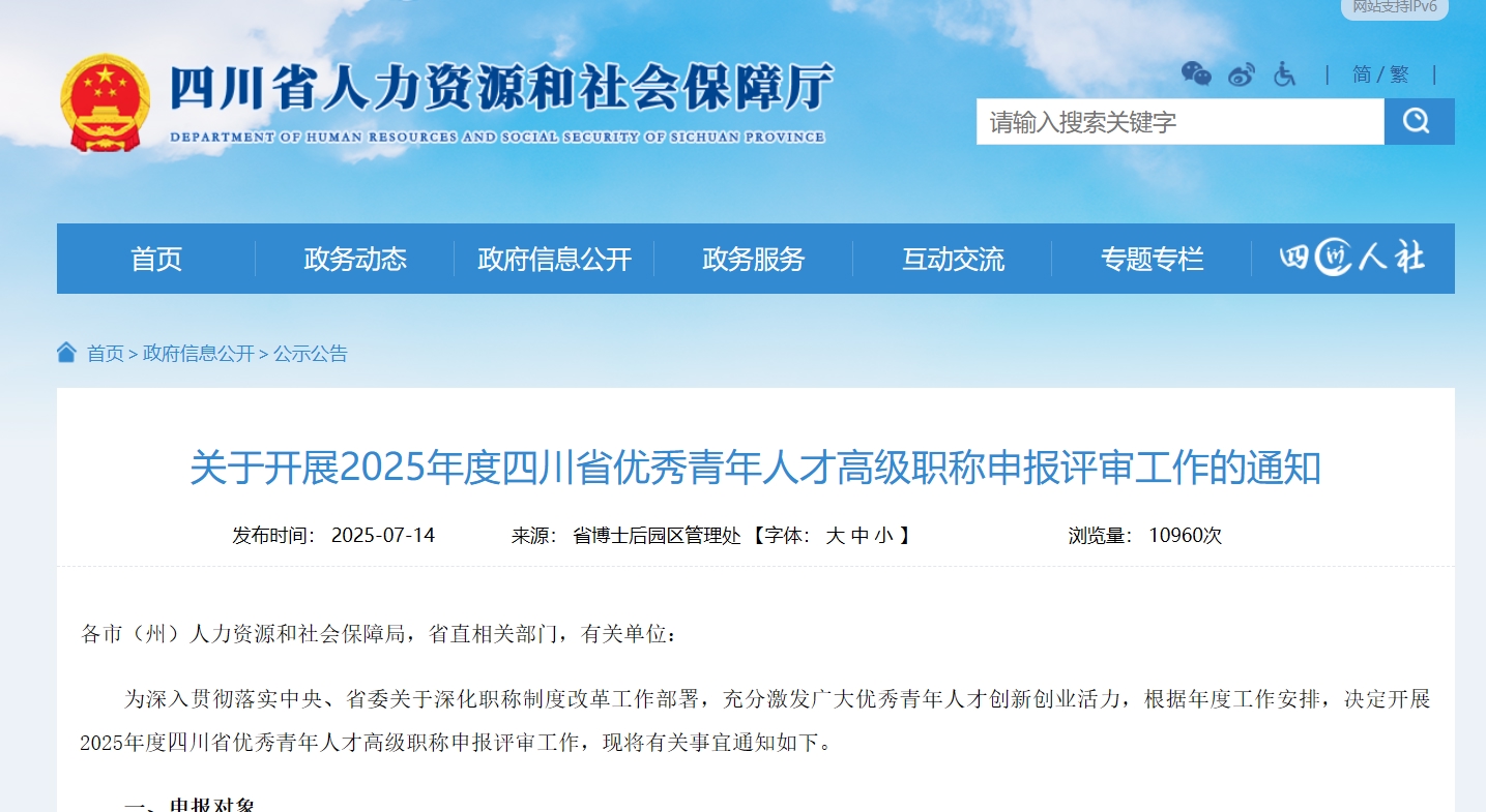 2025年四川省优秀青年人才高级职称申报评审开始了。7月15日9:00至8月10日17:00,申报人可登录四川省职称评审信息系统(https://www.schrss.org.cn:8888/zcpsqd),进入“优秀青年评审”按要求选择四川省优秀青年人才高级职称申报选项并上传相关证明材料,然后选择相应高级职称评审委员会按要求完整上传申报材料。