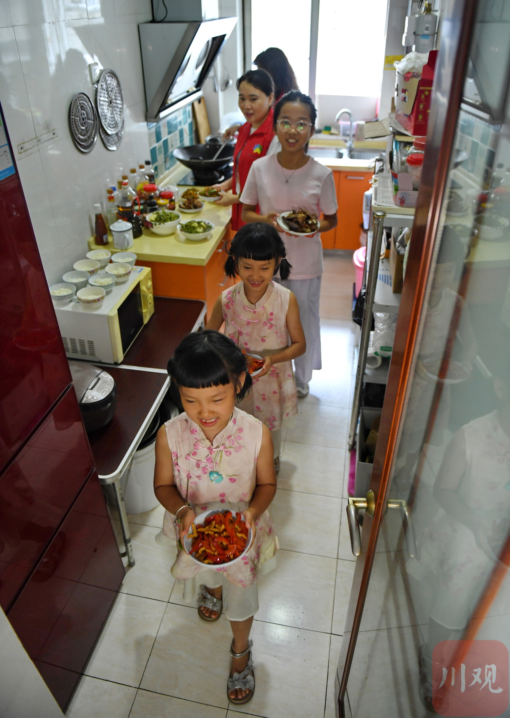 2025年7月15日,在成都市大邑县志愿者家中,志愿者陪伴双职工子女一起吃饭。