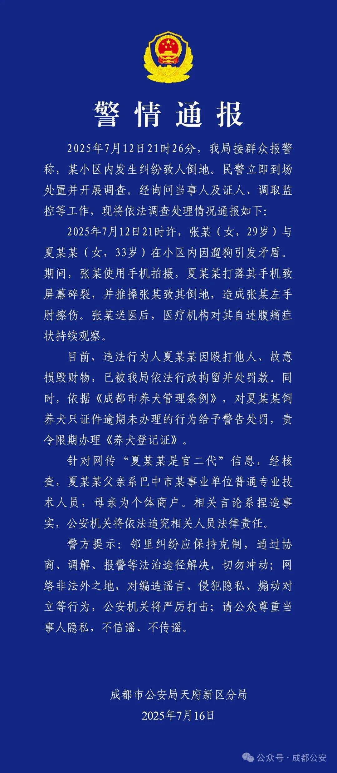 小区内遛狗引发矛盾殴打他人,夏某某已被行政拘留,网传为“官二代”不实