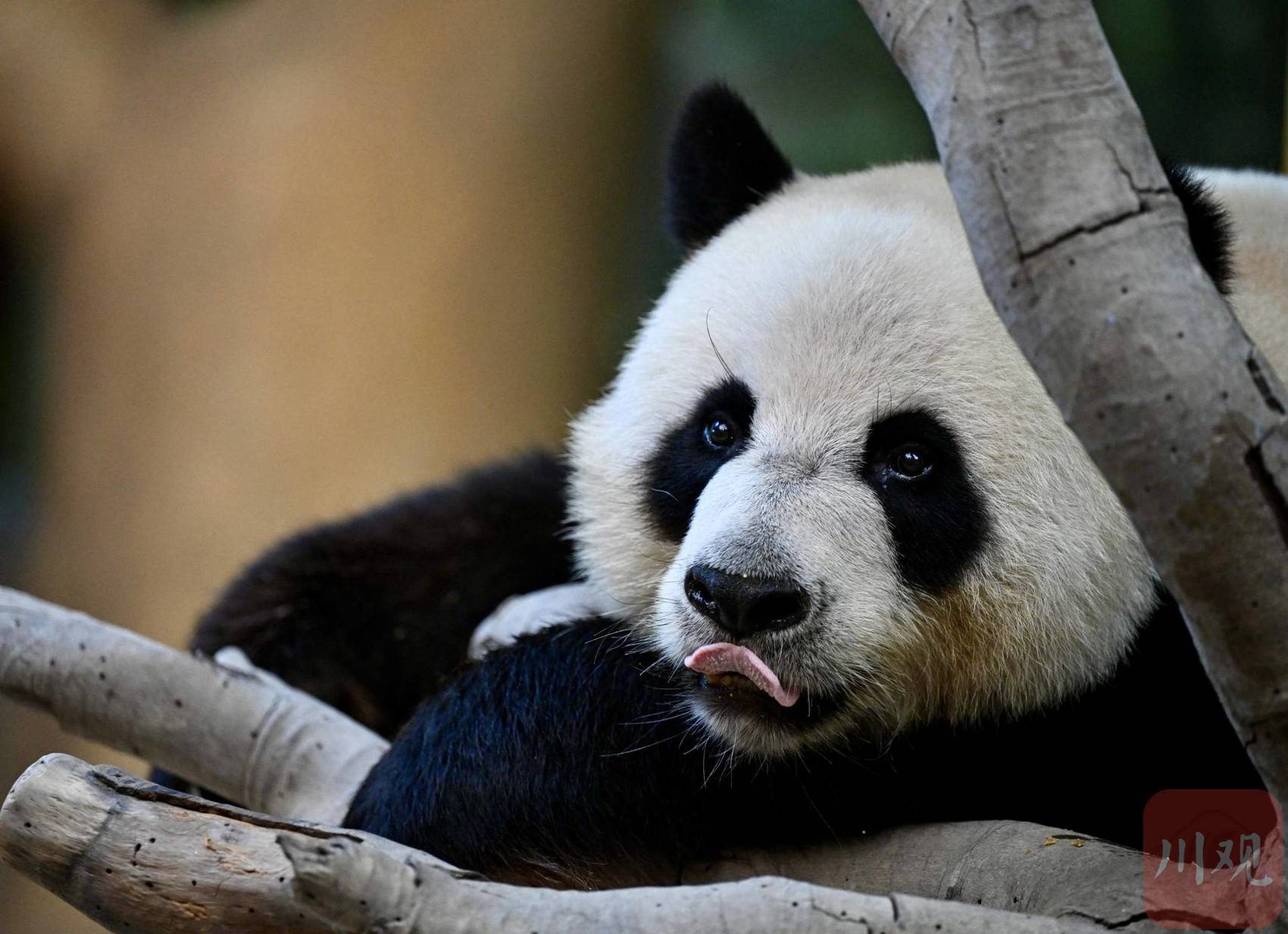 萌萌抱树休憩,圆滚滚身躯与原木相依,憨态十足。