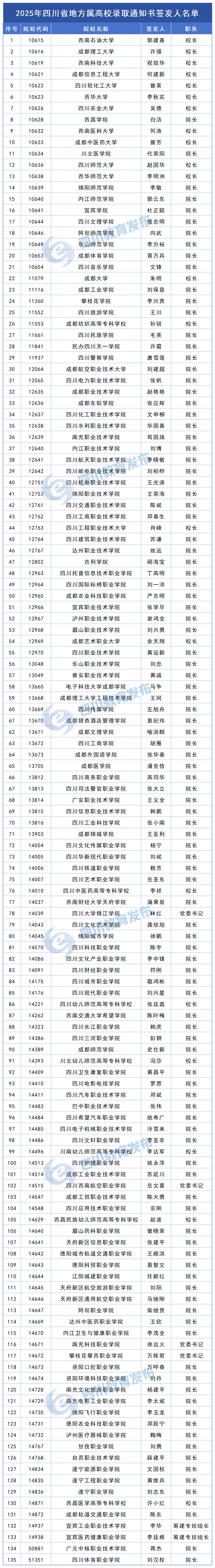 按照《教育部关于做好2025年普通高校招生工作的通知》(教学〔2025〕1号)要求,我省今年继续实行校长签发录取通知书制度,普通高校录取通知书除加盖高校校章外,还应由校(院)长或授权签发人签发,并对录取结果负责。现将我省具有普通高等教育招生资格的地方属高等学校录取通知书签发人名单汇总公布如下(共135所)。