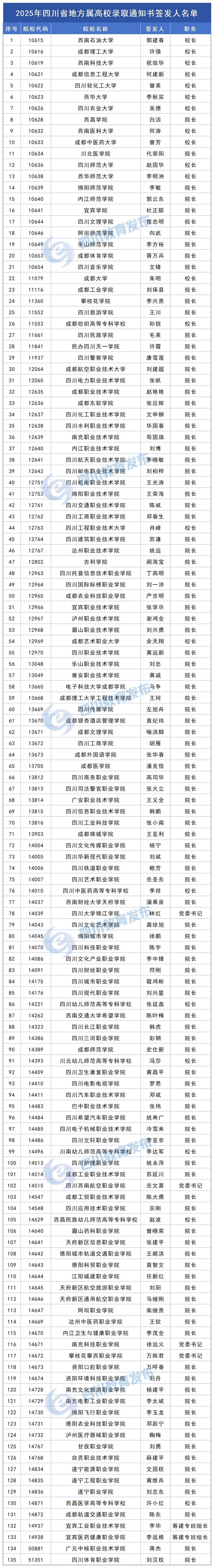 按照《教育部关于做好2025年普通高校招生工作的通知》(教学〔2025〕1号)要求,我省今年继续实行校长签发录取通知书制度,普通高校录取通知书除加盖高校校章外,还应由校(院)长或授权签发人签发,并对录取结果负责。现将我省具有普通高等教育招生资格的地方属高等学校录取通知书签发人名单汇总公布如下(共135所)。